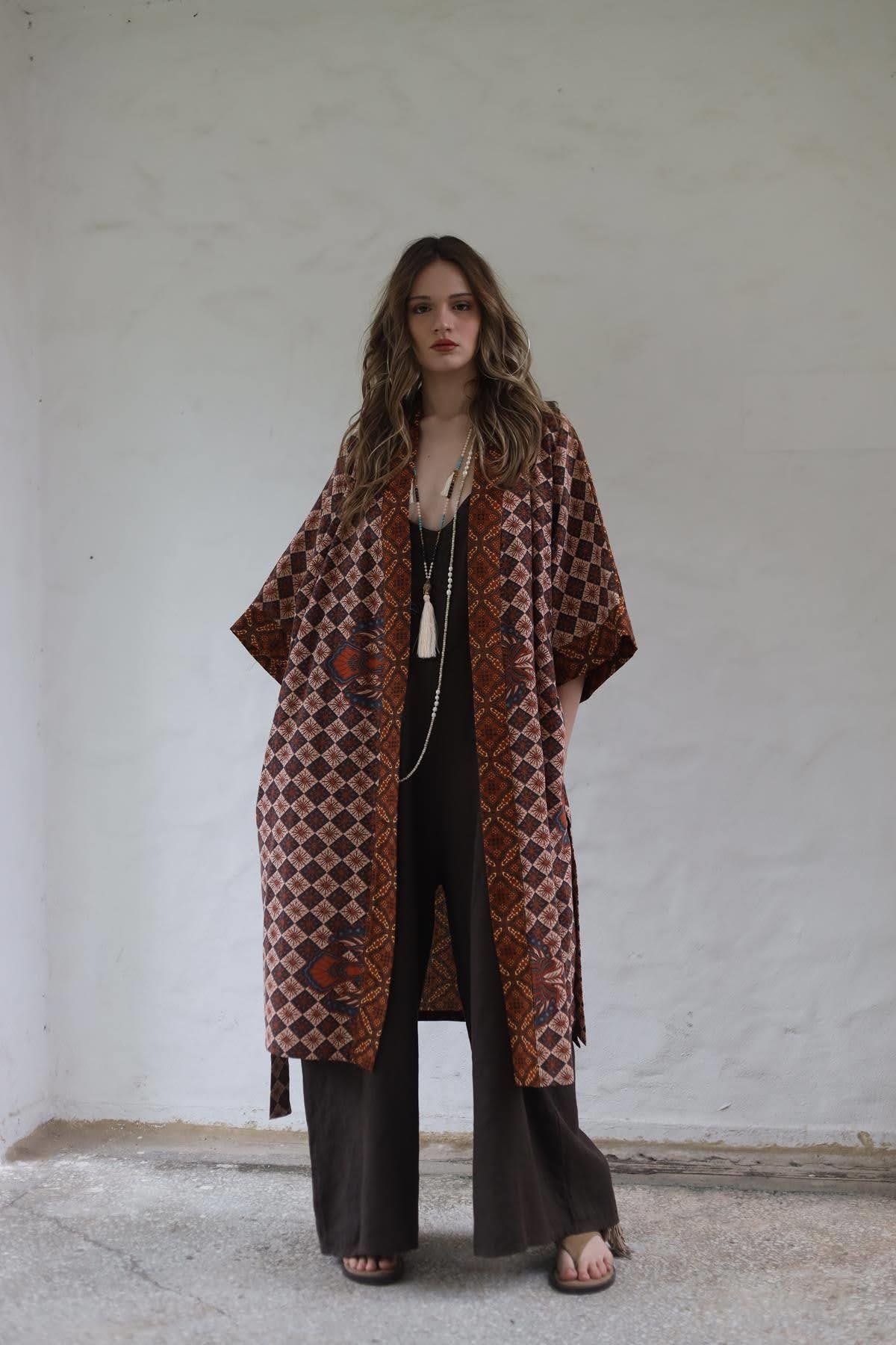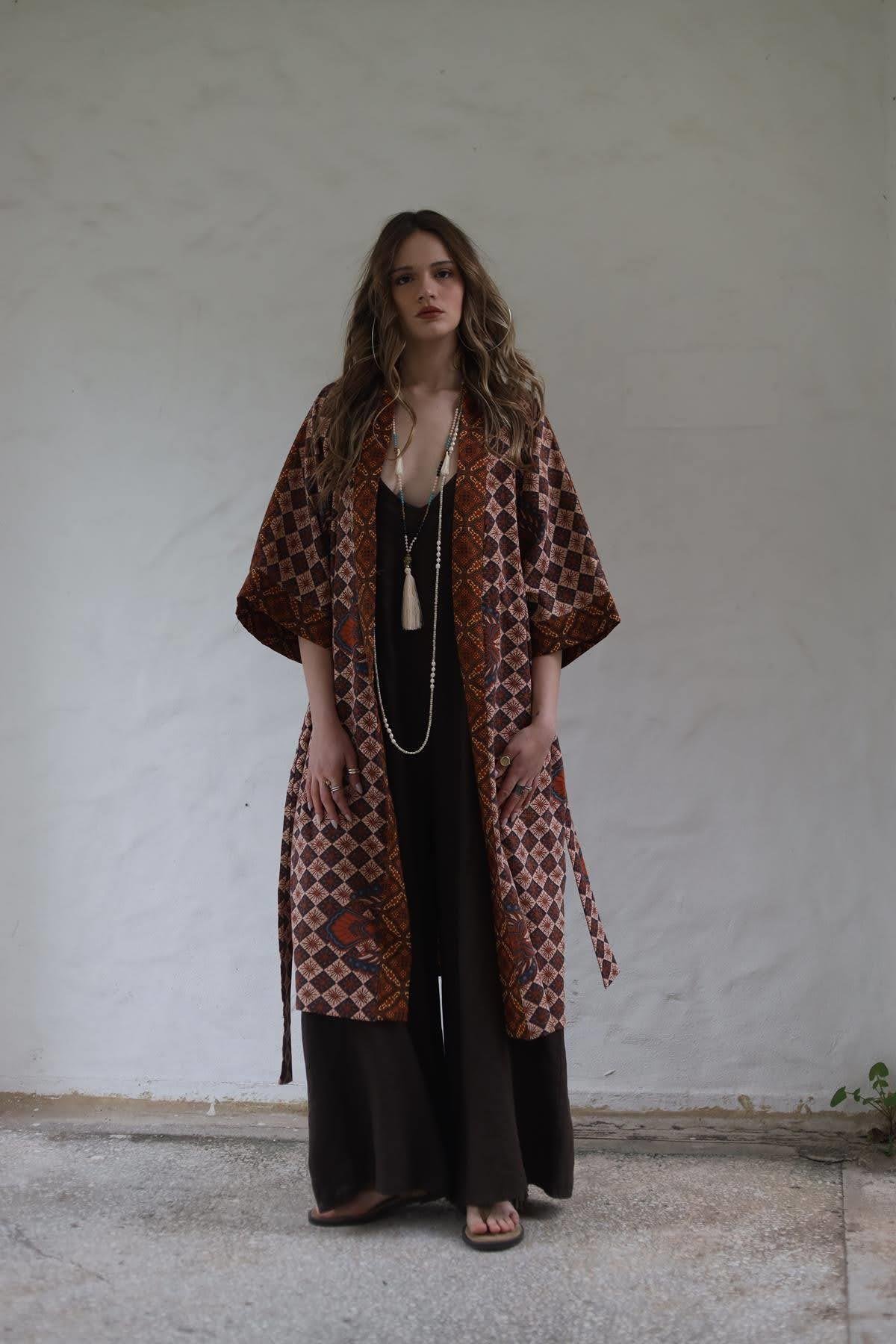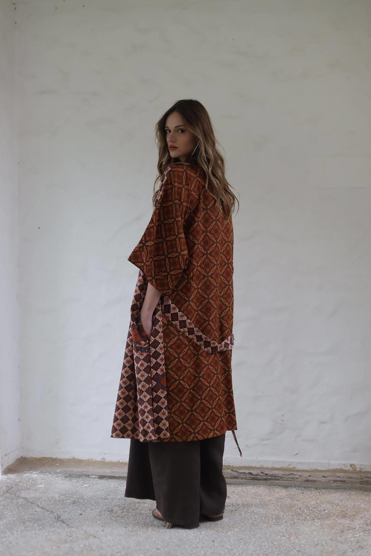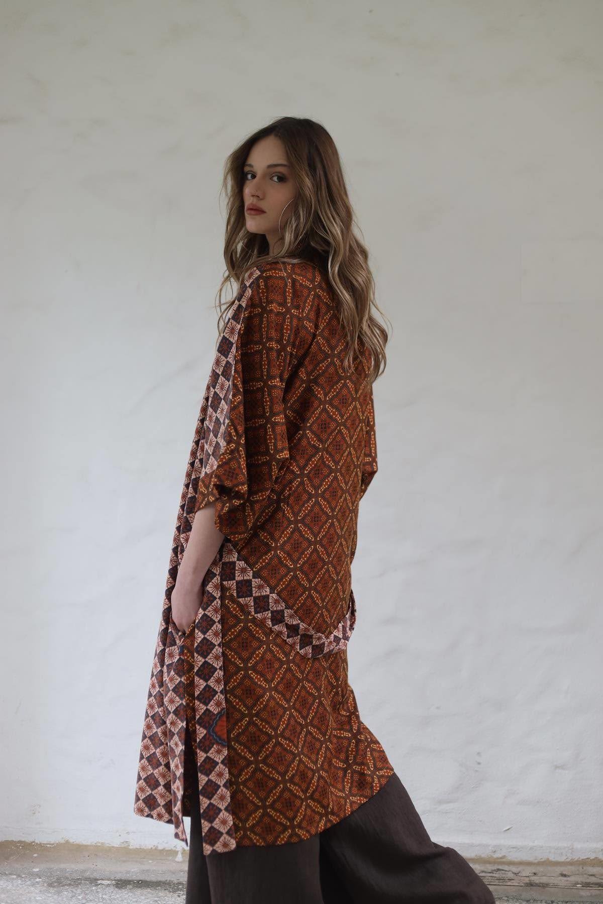 Kiremit Rengi Etnik Desenli Otantik Kaftan