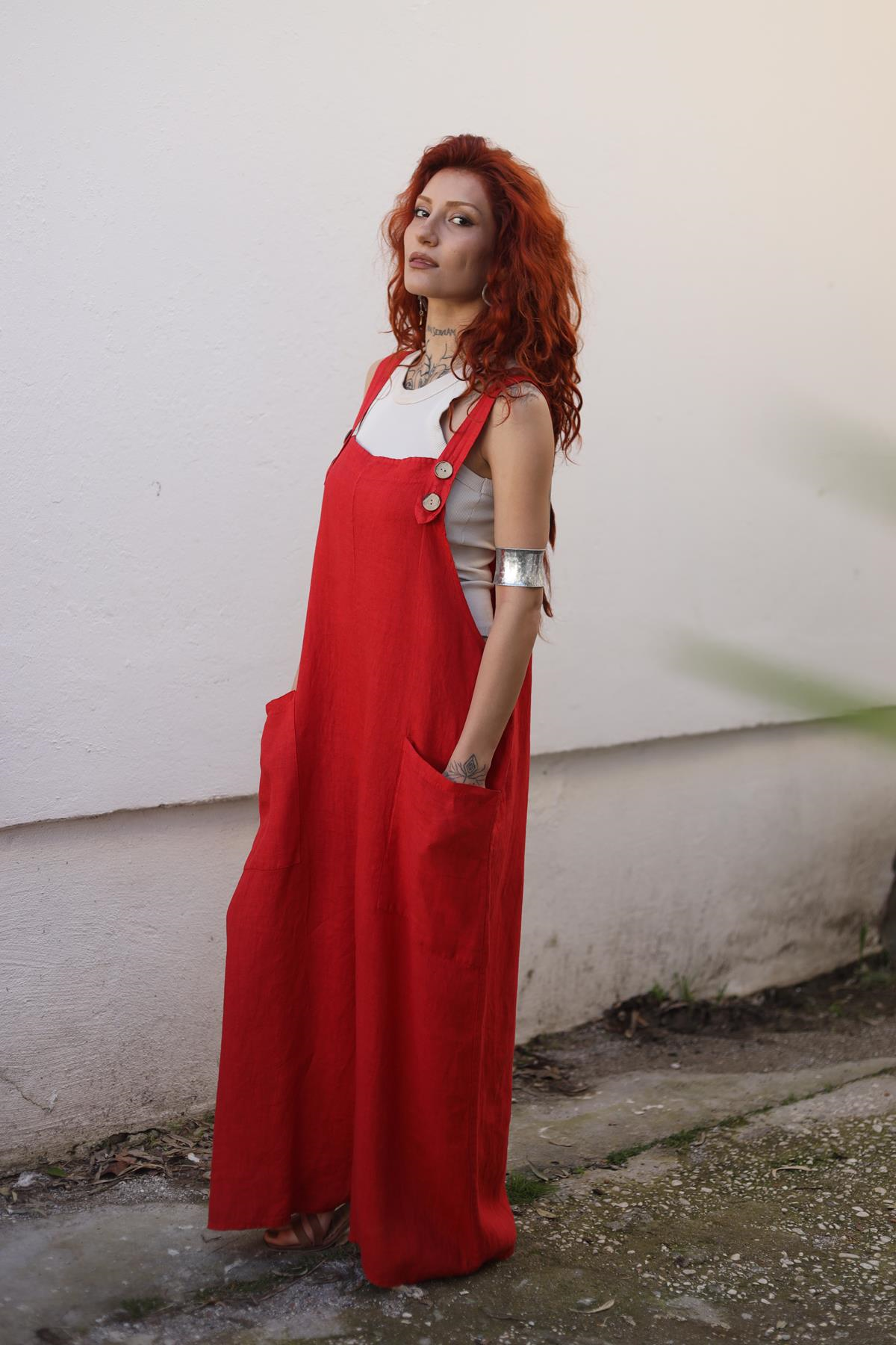 Kırmızı Düğmeli Keten Salopet Tulum (KTLM-FAL-007-KTN-KI-STD)