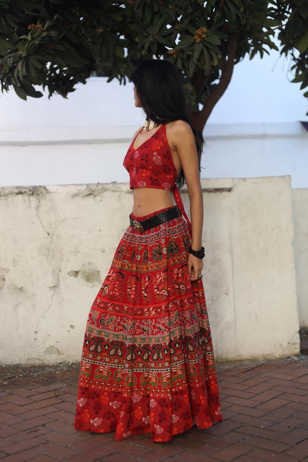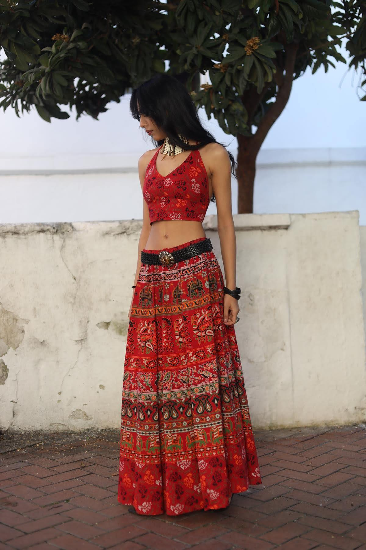 Kırmızı Otantik Desenli Bağlamalı Crop Bluz
