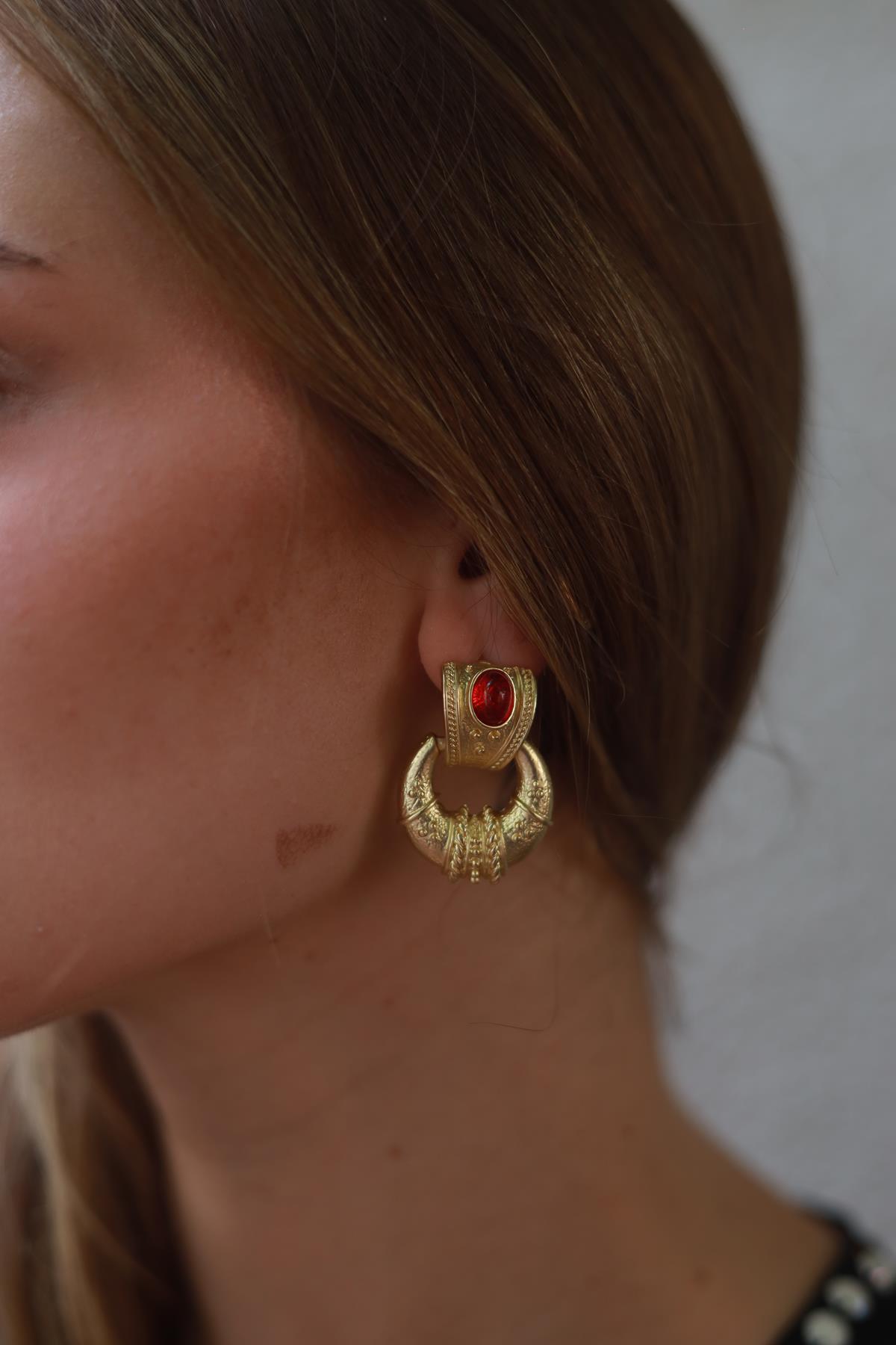 Kırmızı Taş Detaylı Gold Rengi Küpe