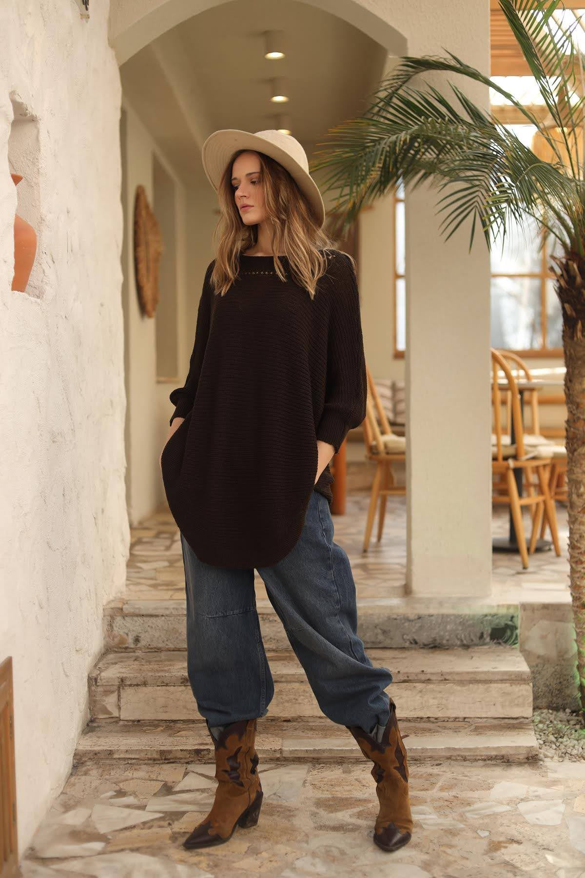Koyu Kahverengi Yakası Ajurlu Selanik Tunik