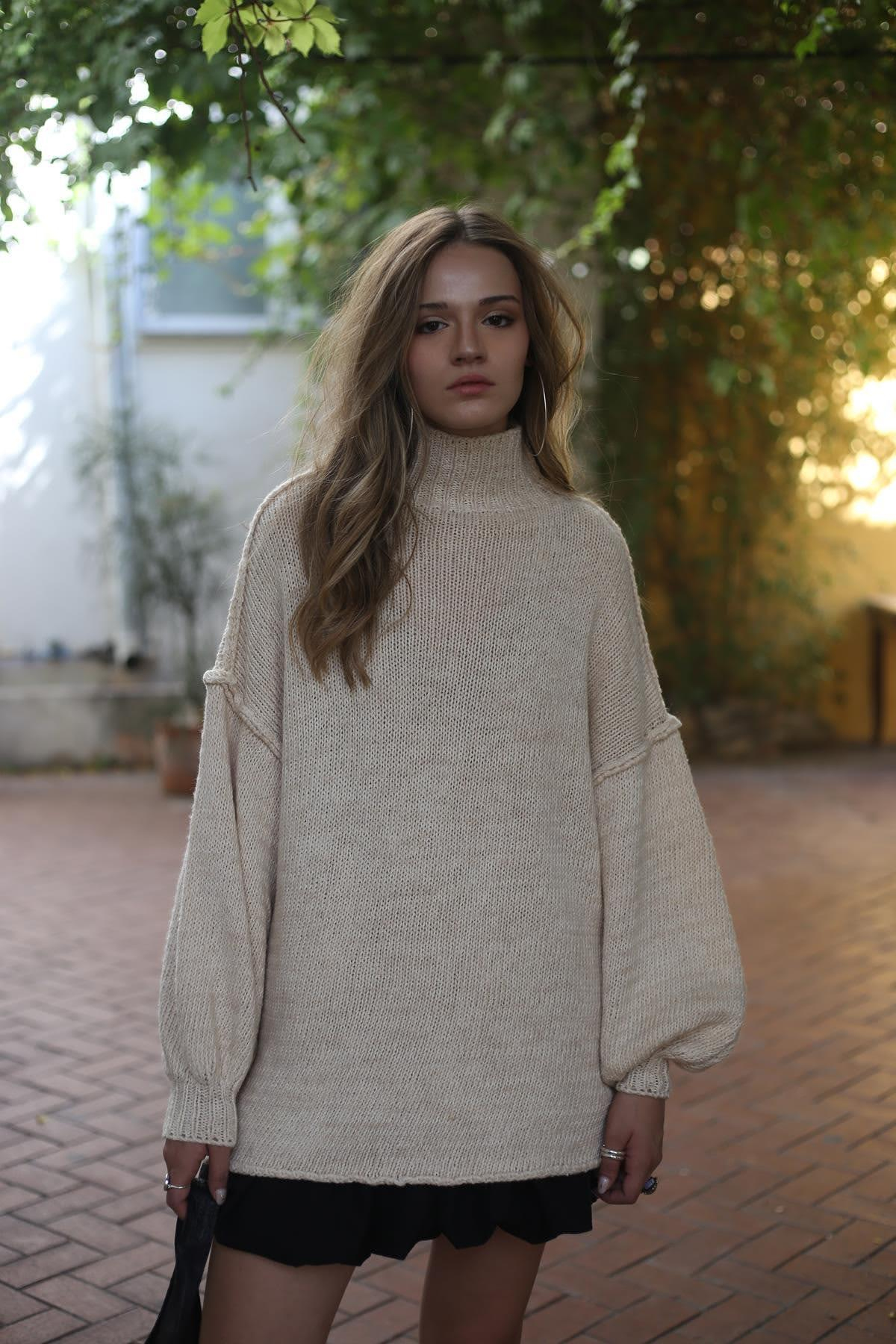 Krem Rengi Balıkçı Yaka Dikiş Detaylı Kazak