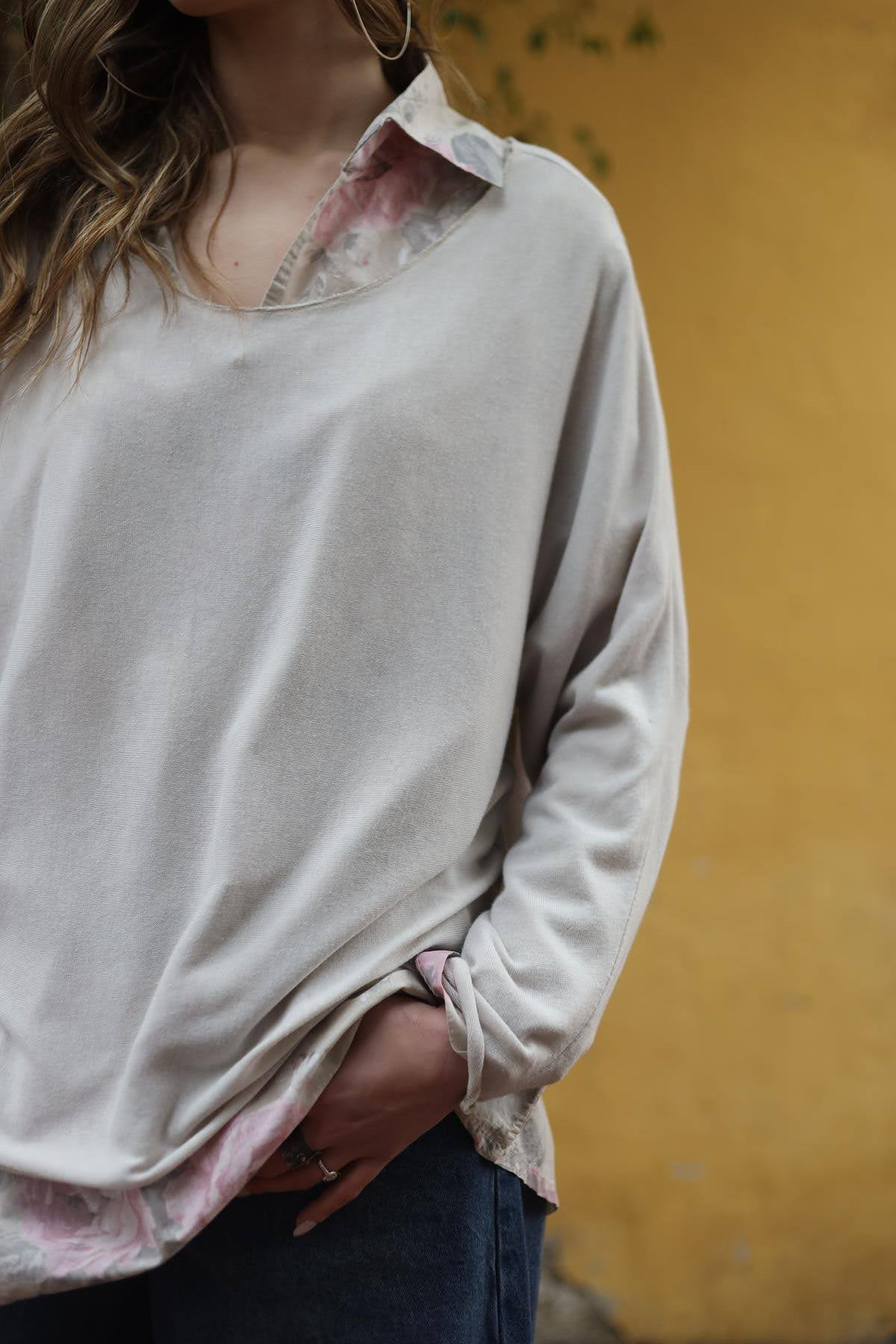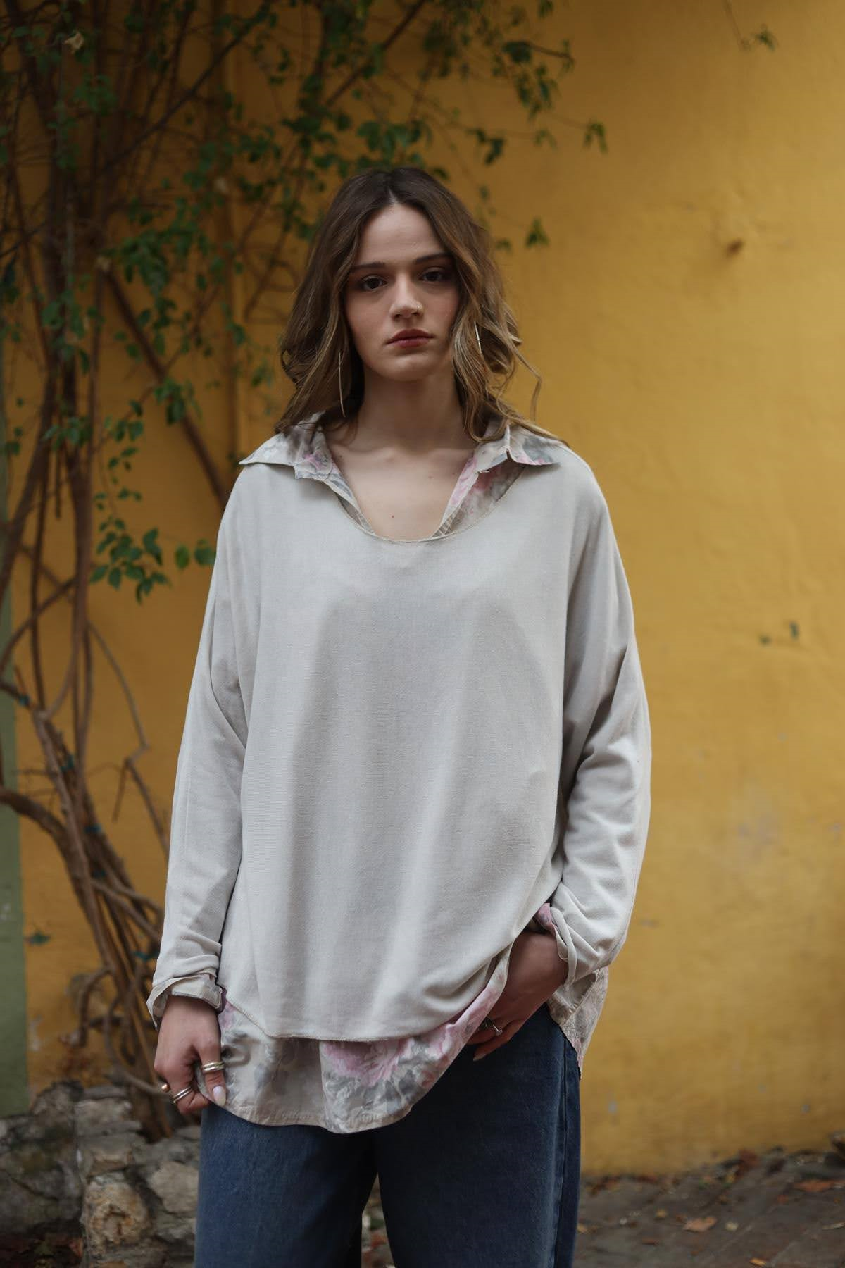 Krem Rengi Çiçek Desenli Gömlek Detaylı Bluz (KB-FAL-020-PA-KR-STD)