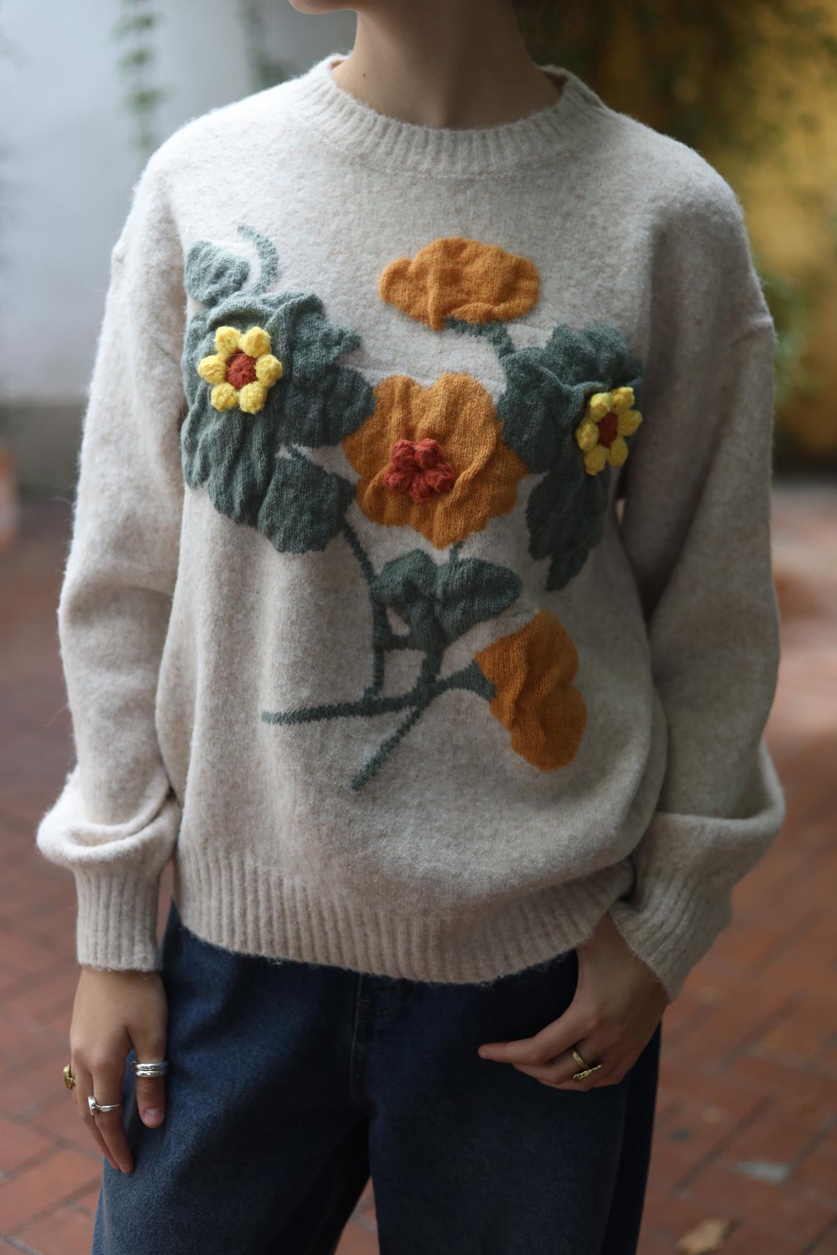 Krem Rengi Çiçek Kabartmalı Kazak (KKZK-PM-002-PO-KR-STD)