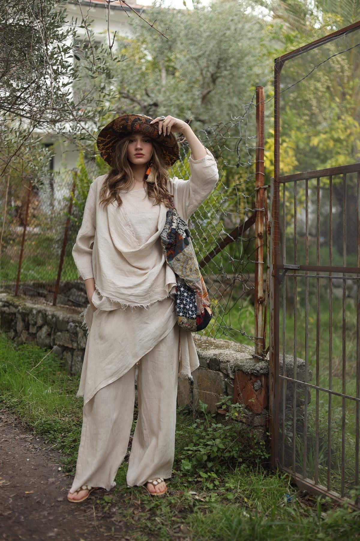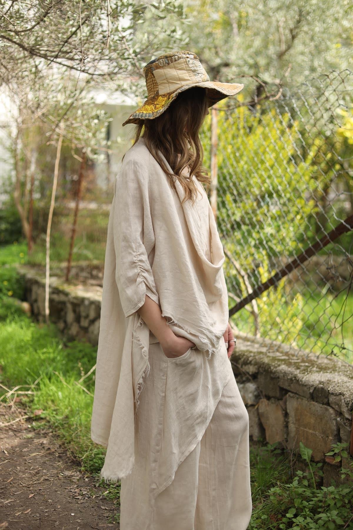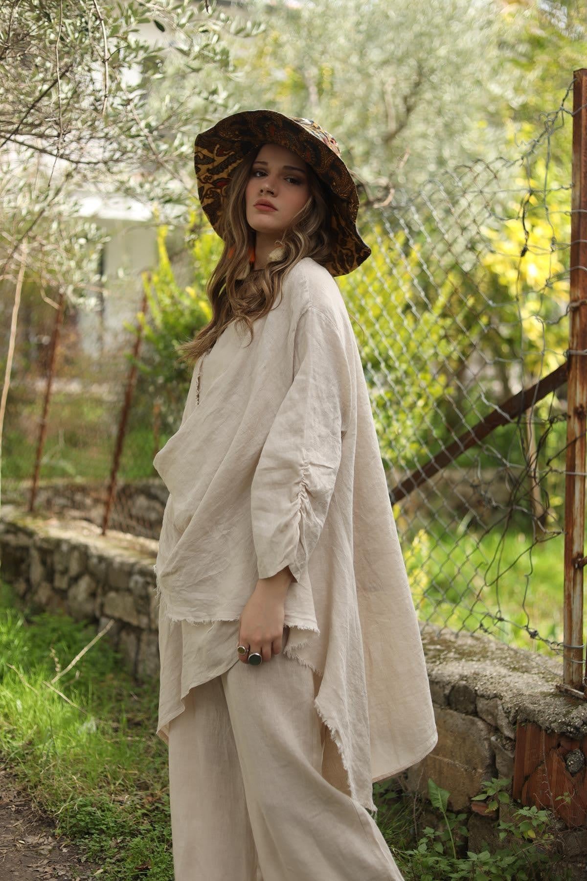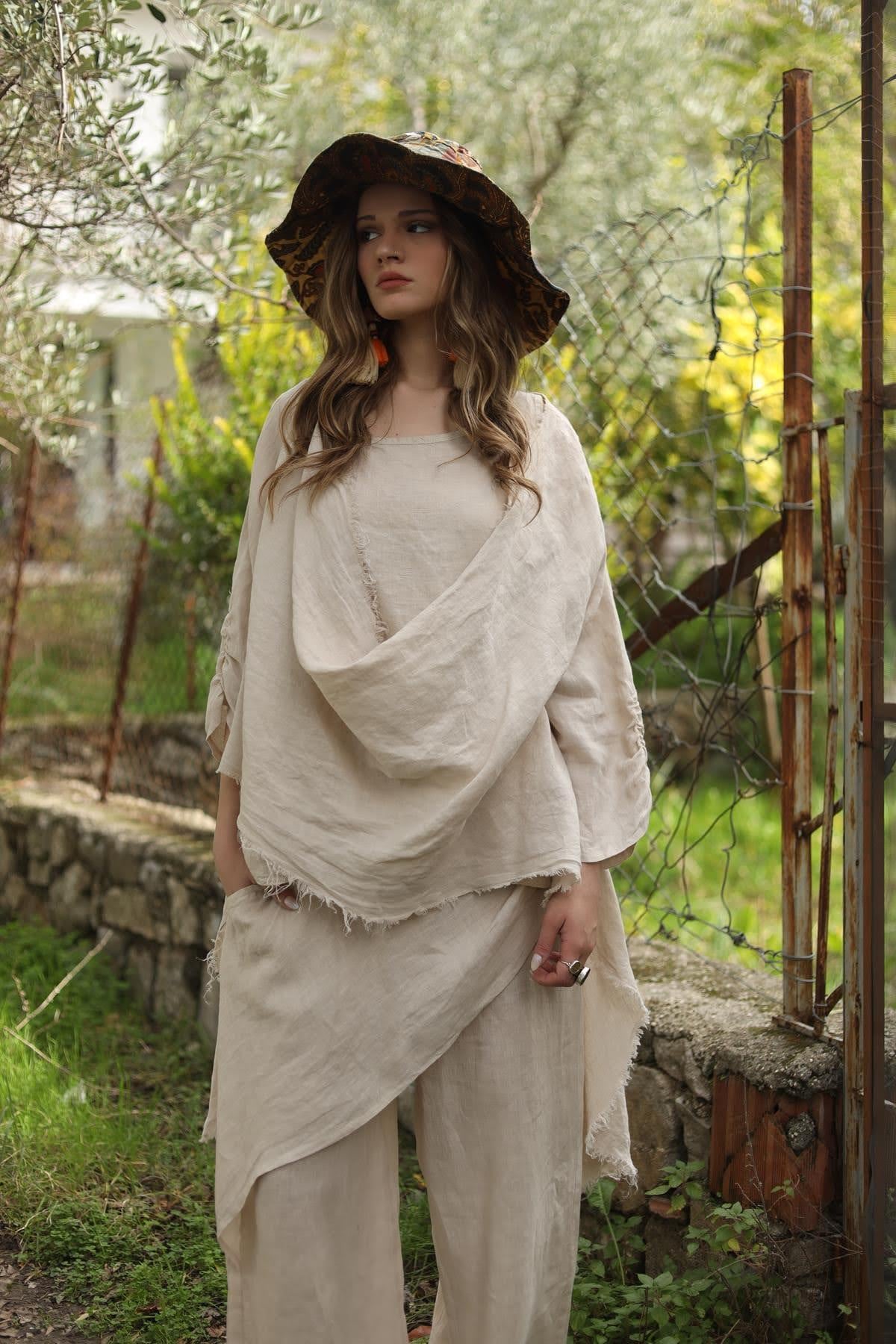 Krem Rengi Degaje Yaka Önü Kısa Keten Tunik (KTNK-FAL-006-KTN-KR-STD)