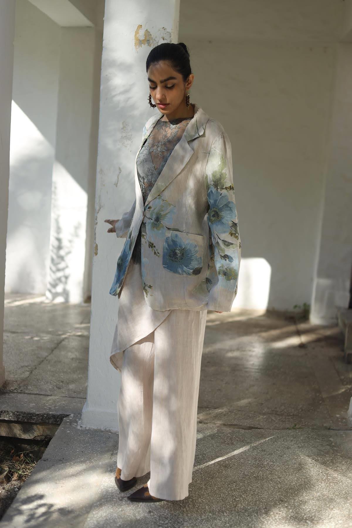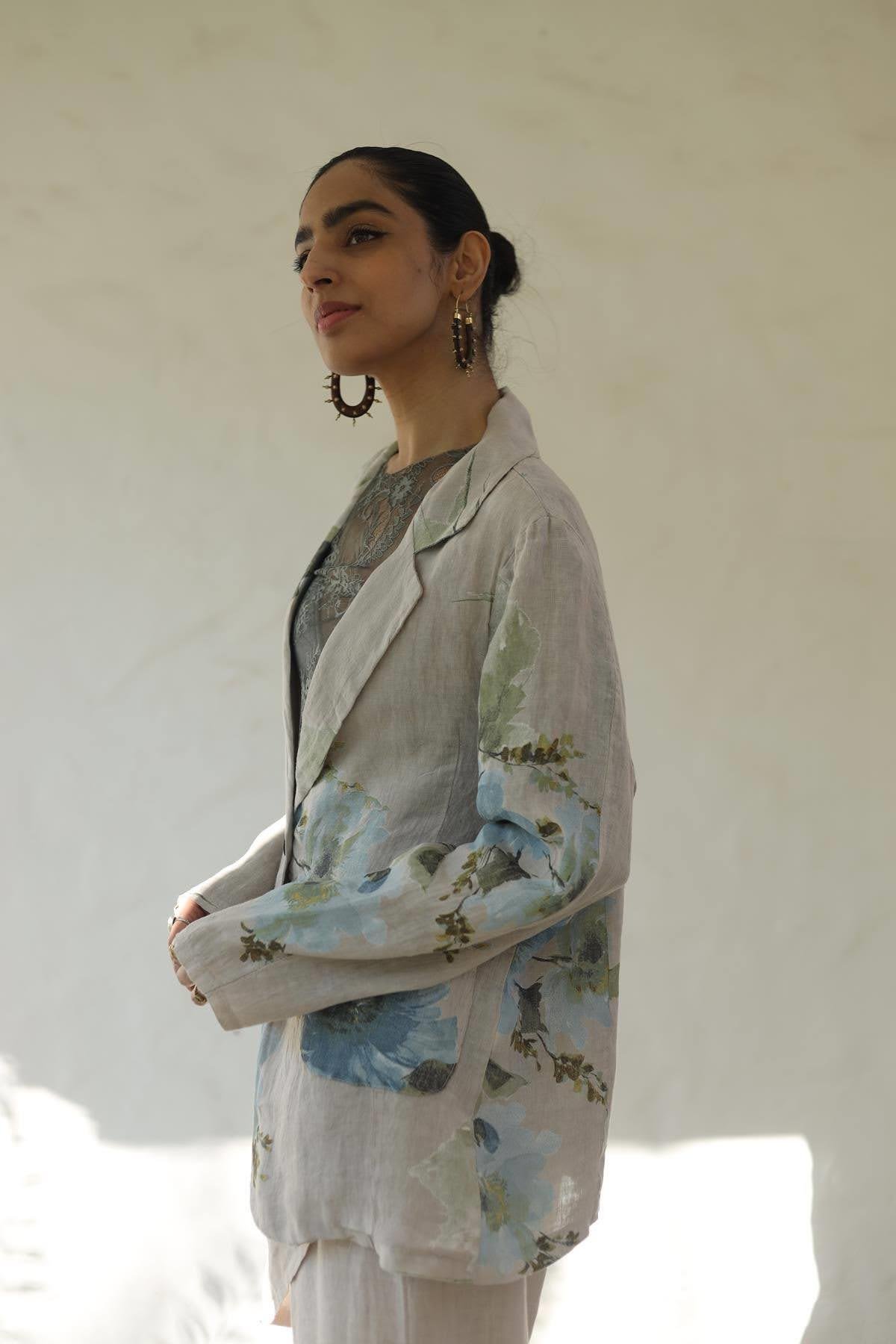 Krem Rengi Desenli Tek Düğmeli Keten Ceket