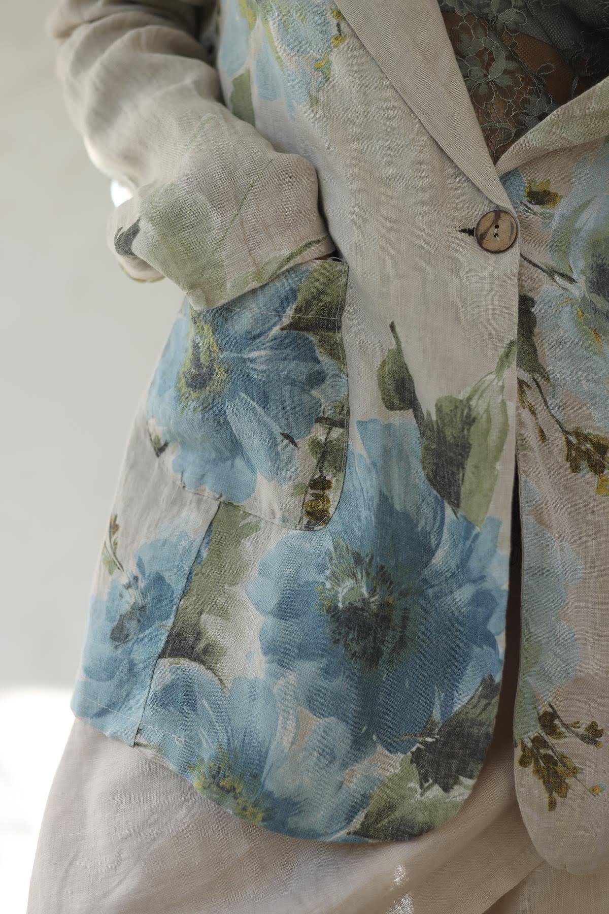 Krem Rengi Desenli Tek Düğmeli Keten Ceket (KC-FAL-020-KTN-KR-STD)