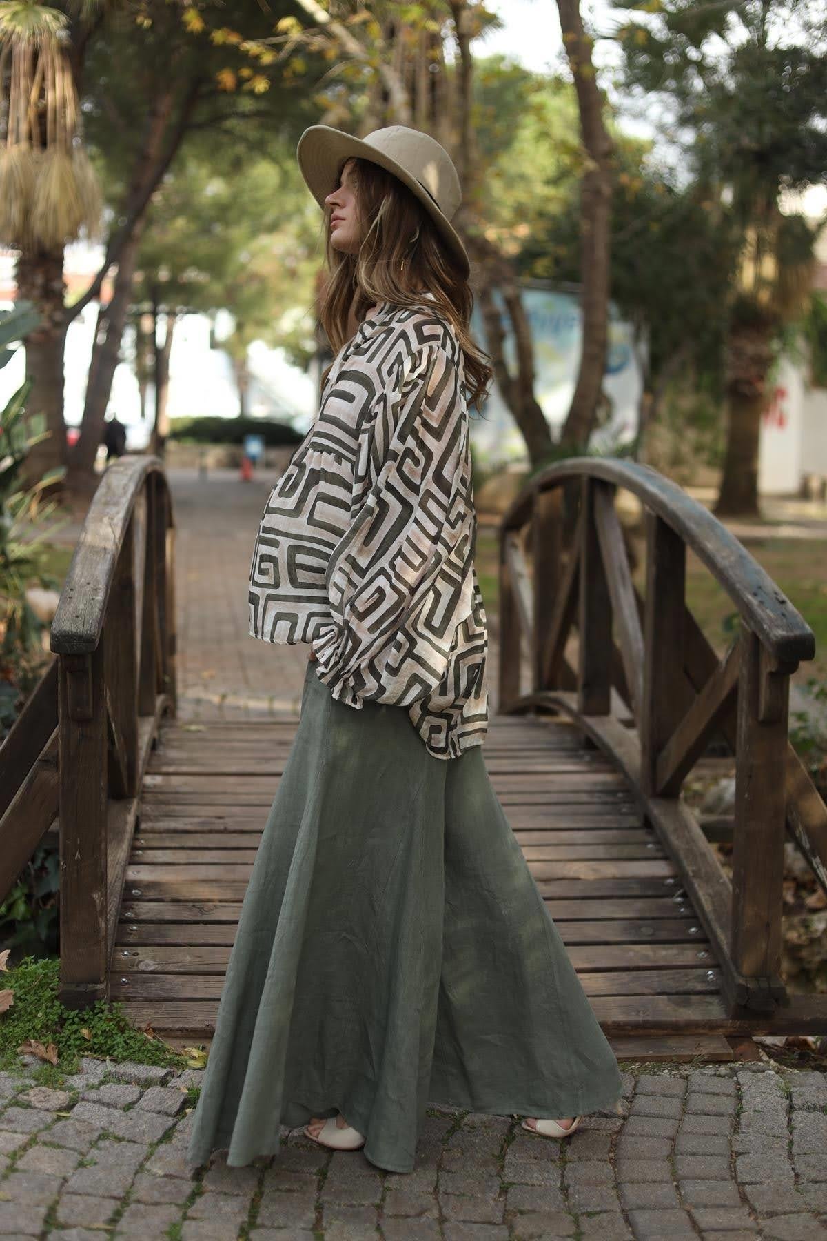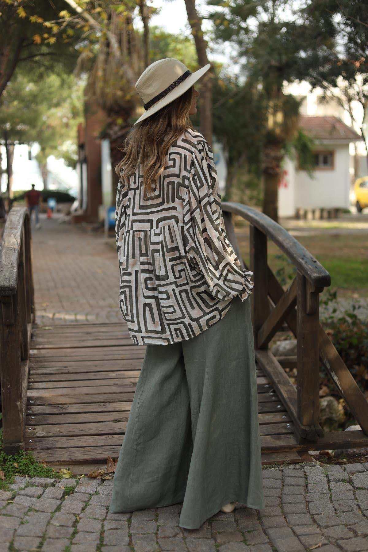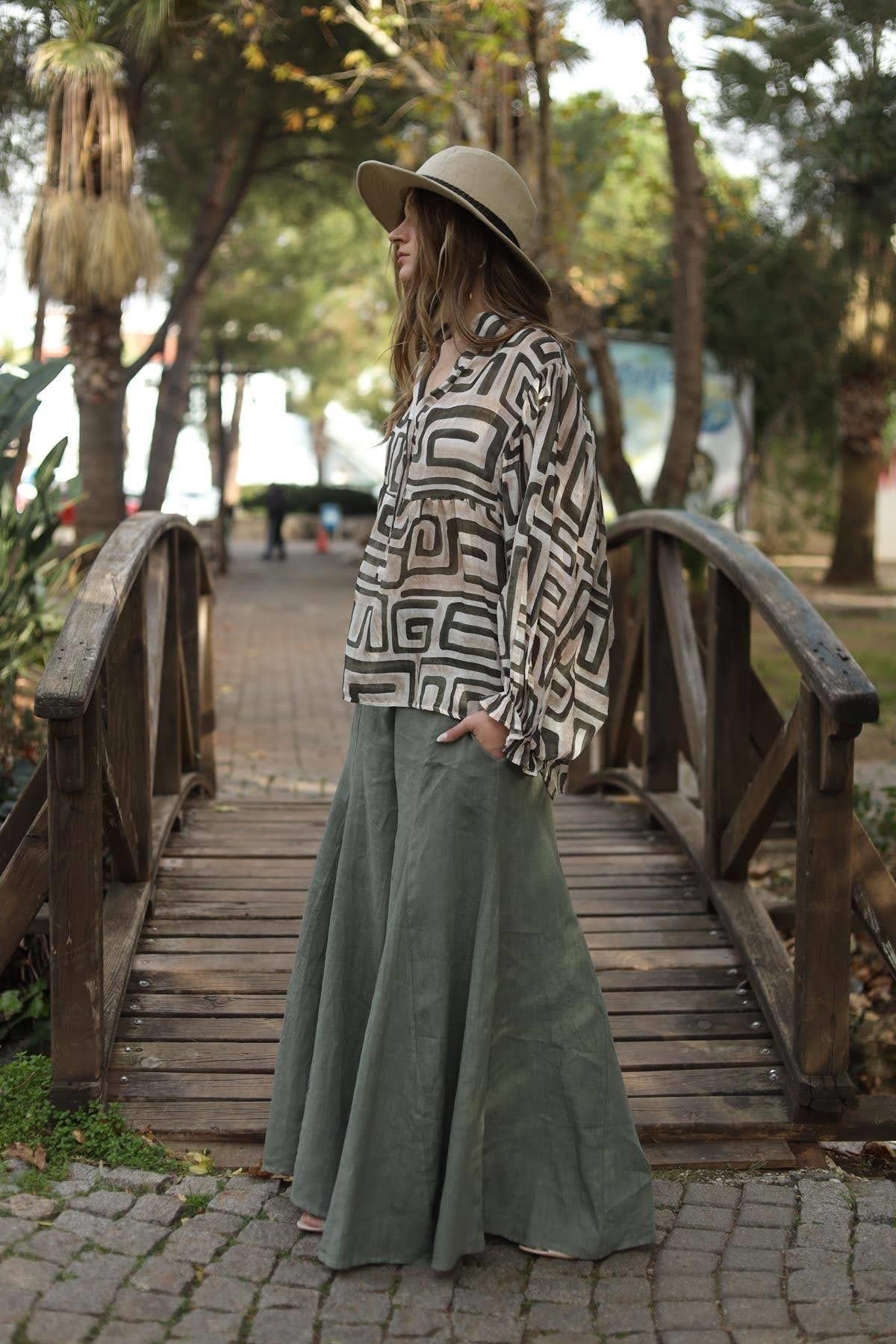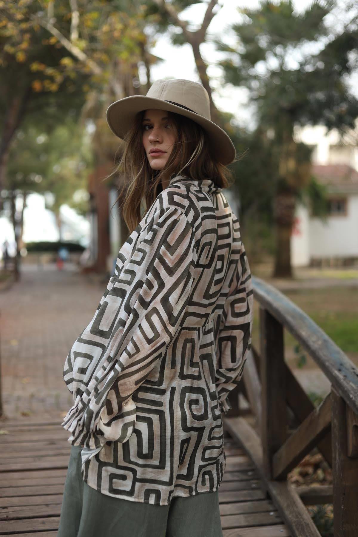 Krem Rengi Desenli Yarasa Kol Düğmeli Bluz