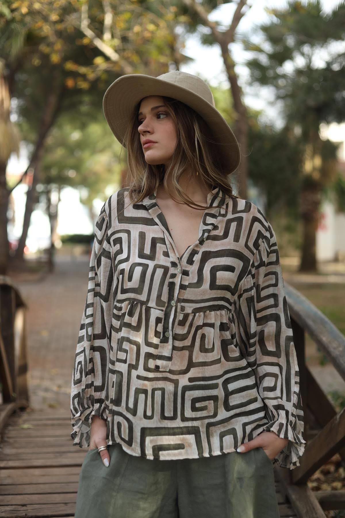 Krem Rengi Desenli Yarasa Kol Düğmeli Bluz (KB-SIT-021-TEN-KR-STD)