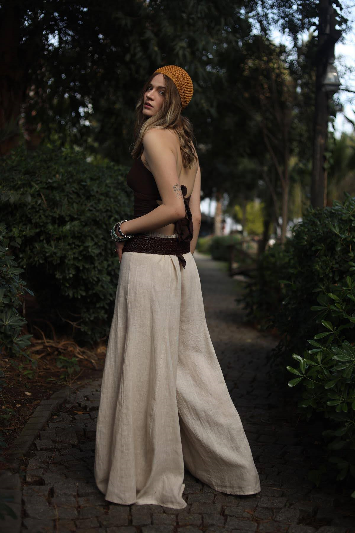 Krem Rengi Keten Pantolon Etek