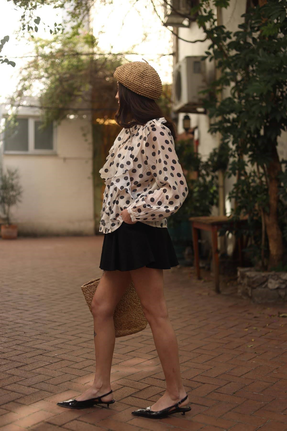 Krem Rengi Puantiyeli Yakası Volanlı Gömlek