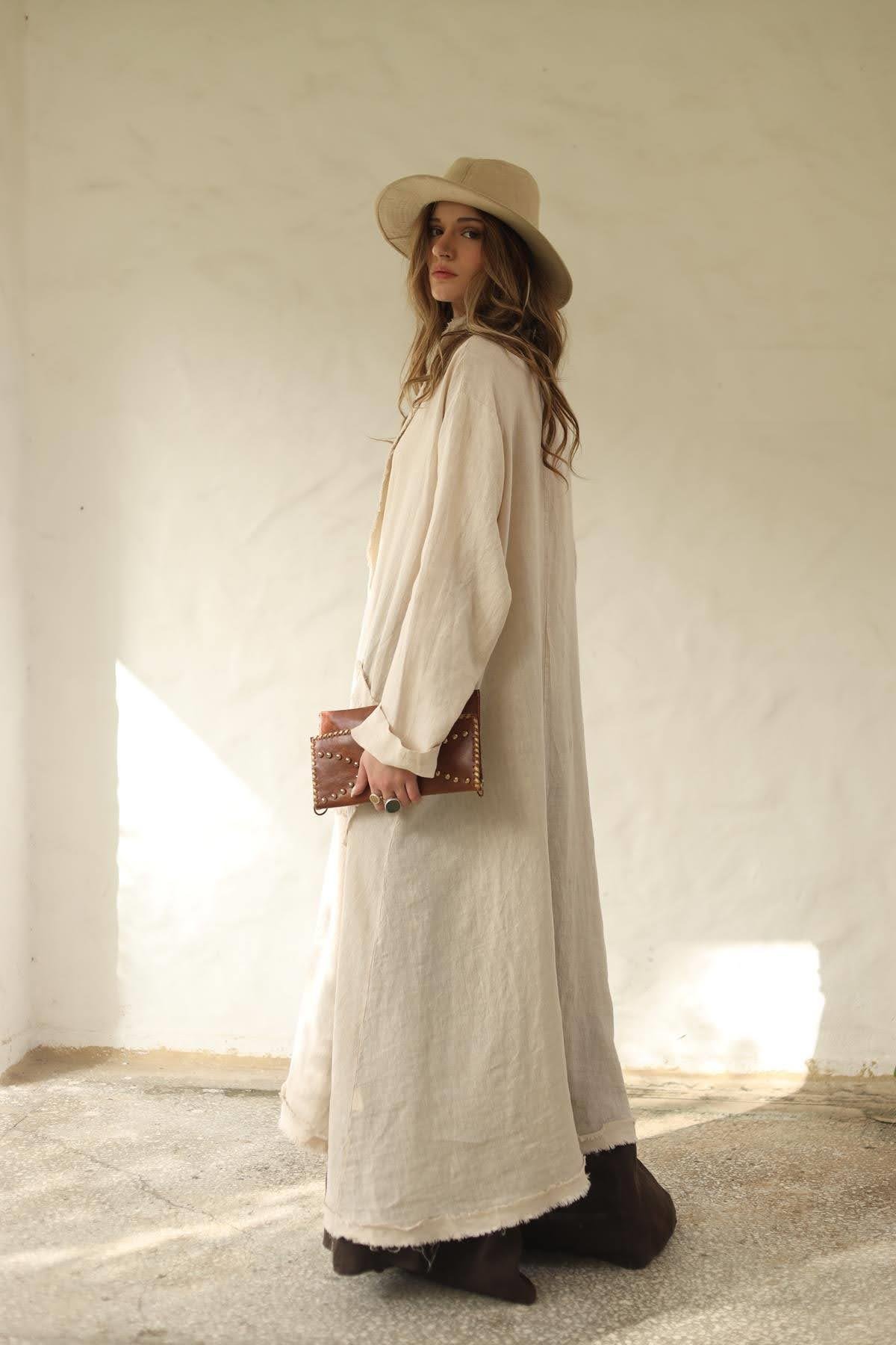 Krem Rengi Püskül Detaylı Cepli Keten Kaftan (KKFN-FAL-020-KTN-KR-STD)