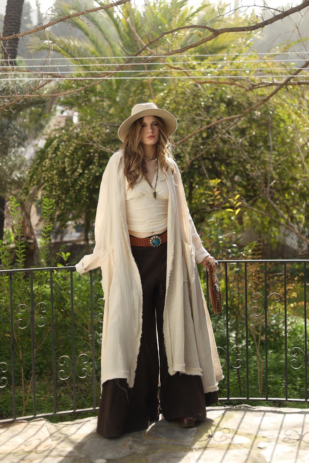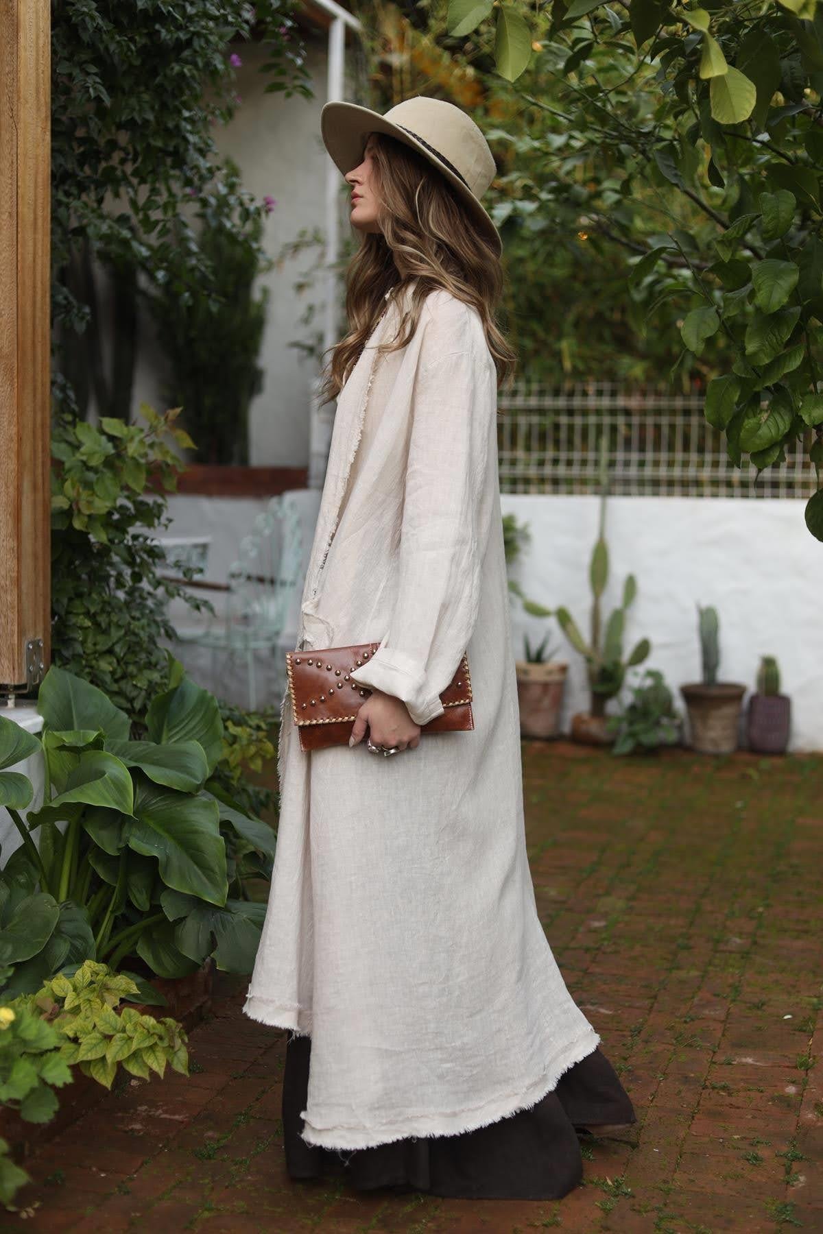 Krem Rengi Püskül Detaylı Cepli Keten Kaftan