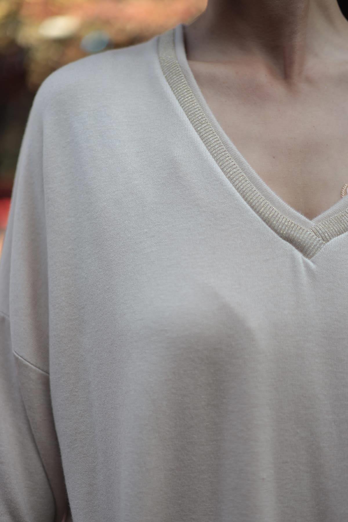 Krem Rengi Simli V Yaka Şardonlu Bluz (KB-PM-074-VI-KR-STD)
