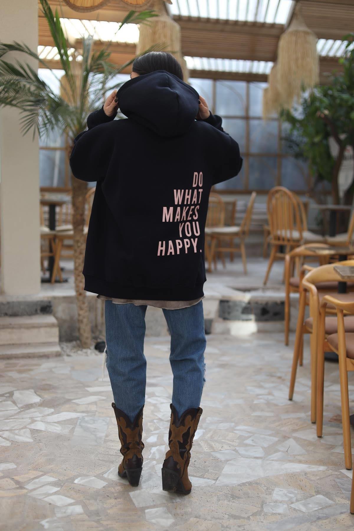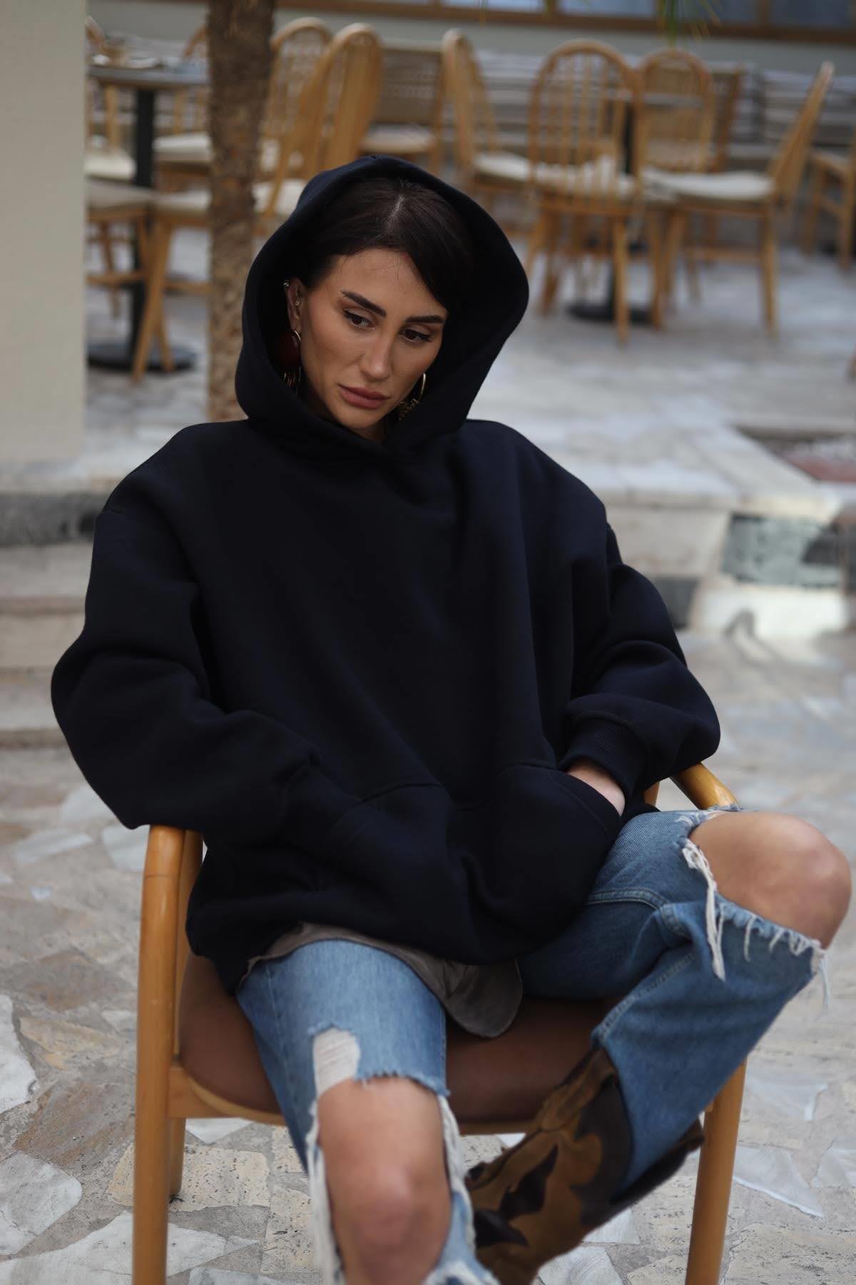 Lacivert Arkası Yazılı Kanguru Cepli Sweatshirt