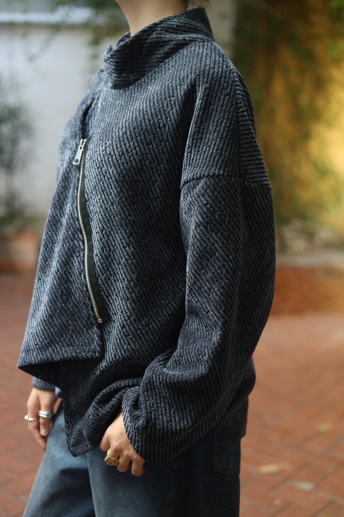 Lacivert Asimetrik Fermuarlı Kadife Ceket