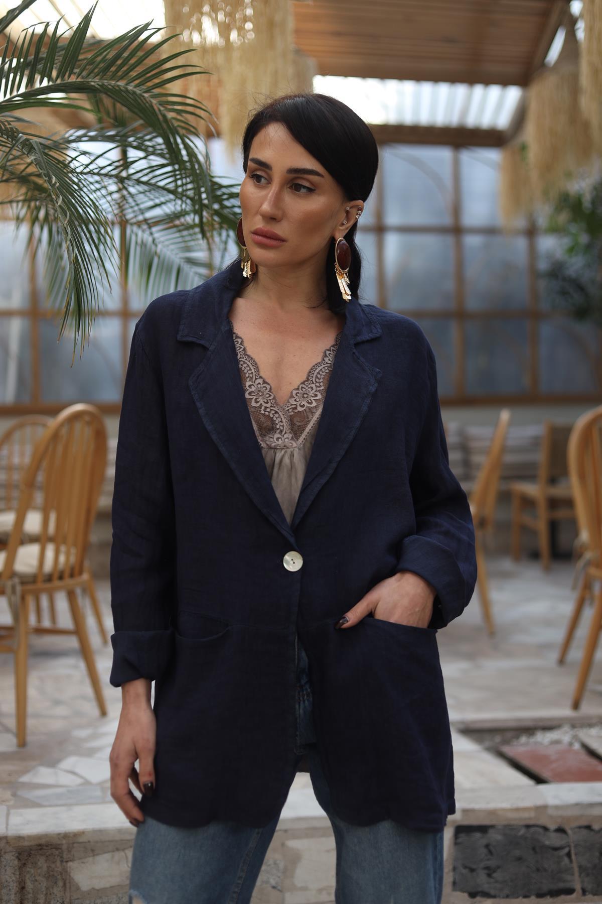 Lacivert Cepli Tek Düğmeli Keten Ceket
