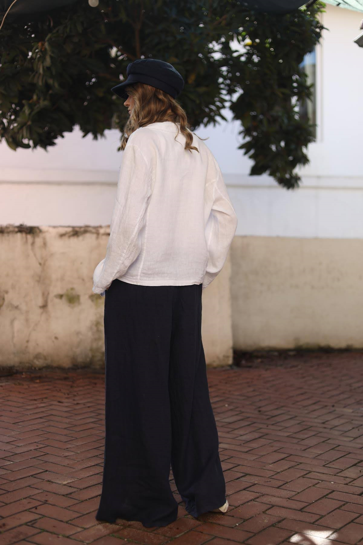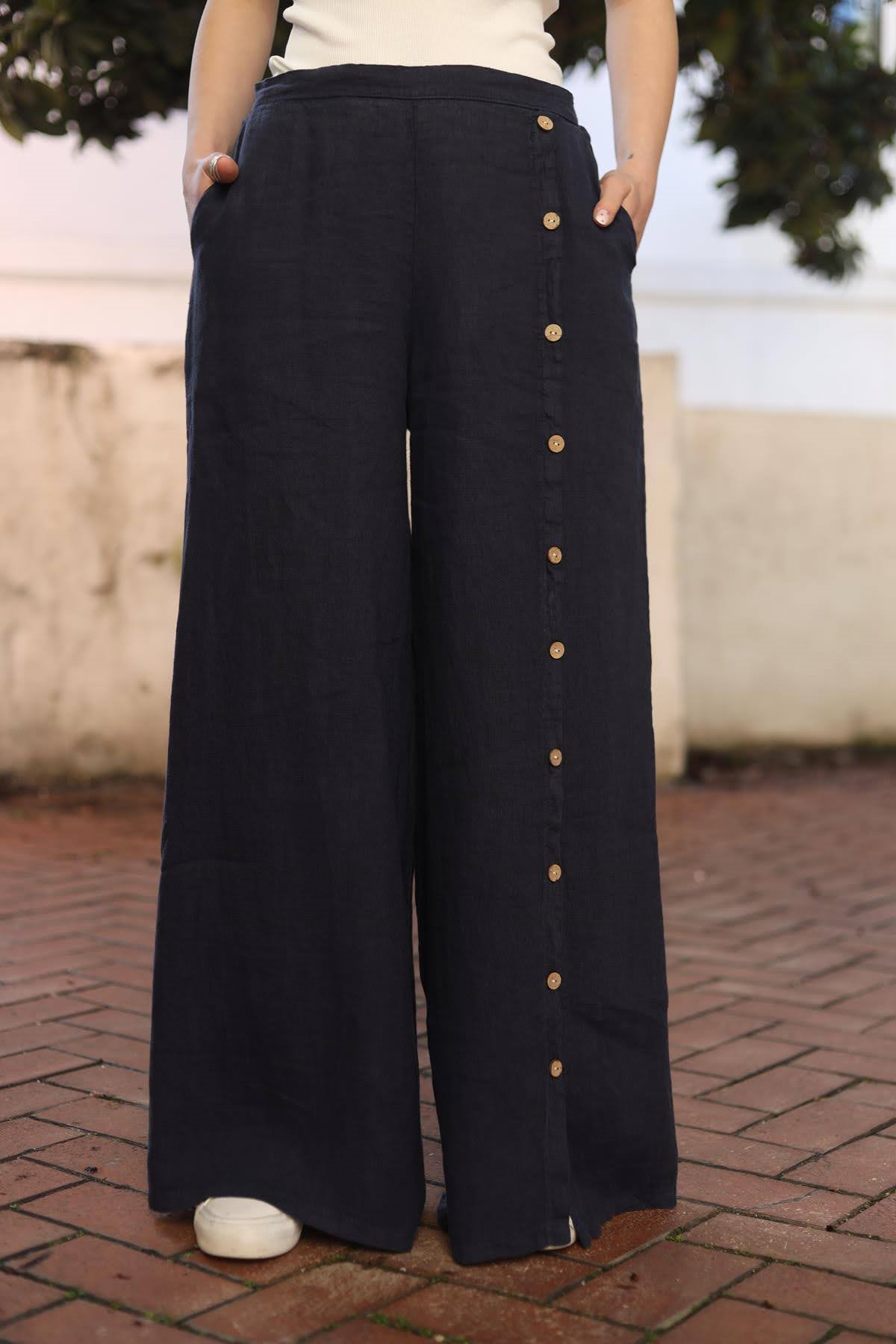 Lacivert Düğme Detay Yırtmaçlı Keten Pantolon (KP-FAL-018-KTN-LA-STD)