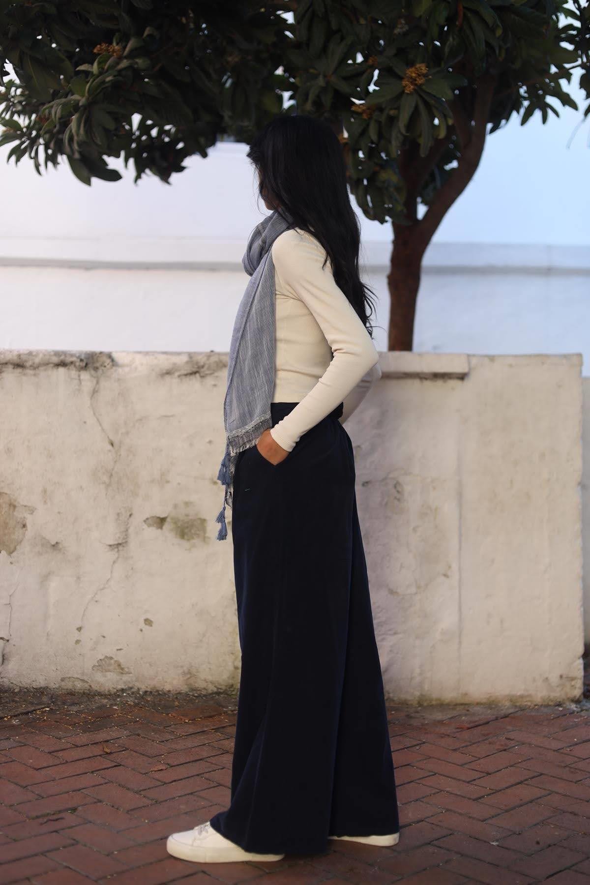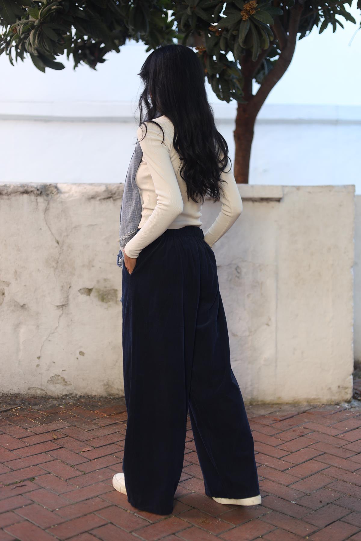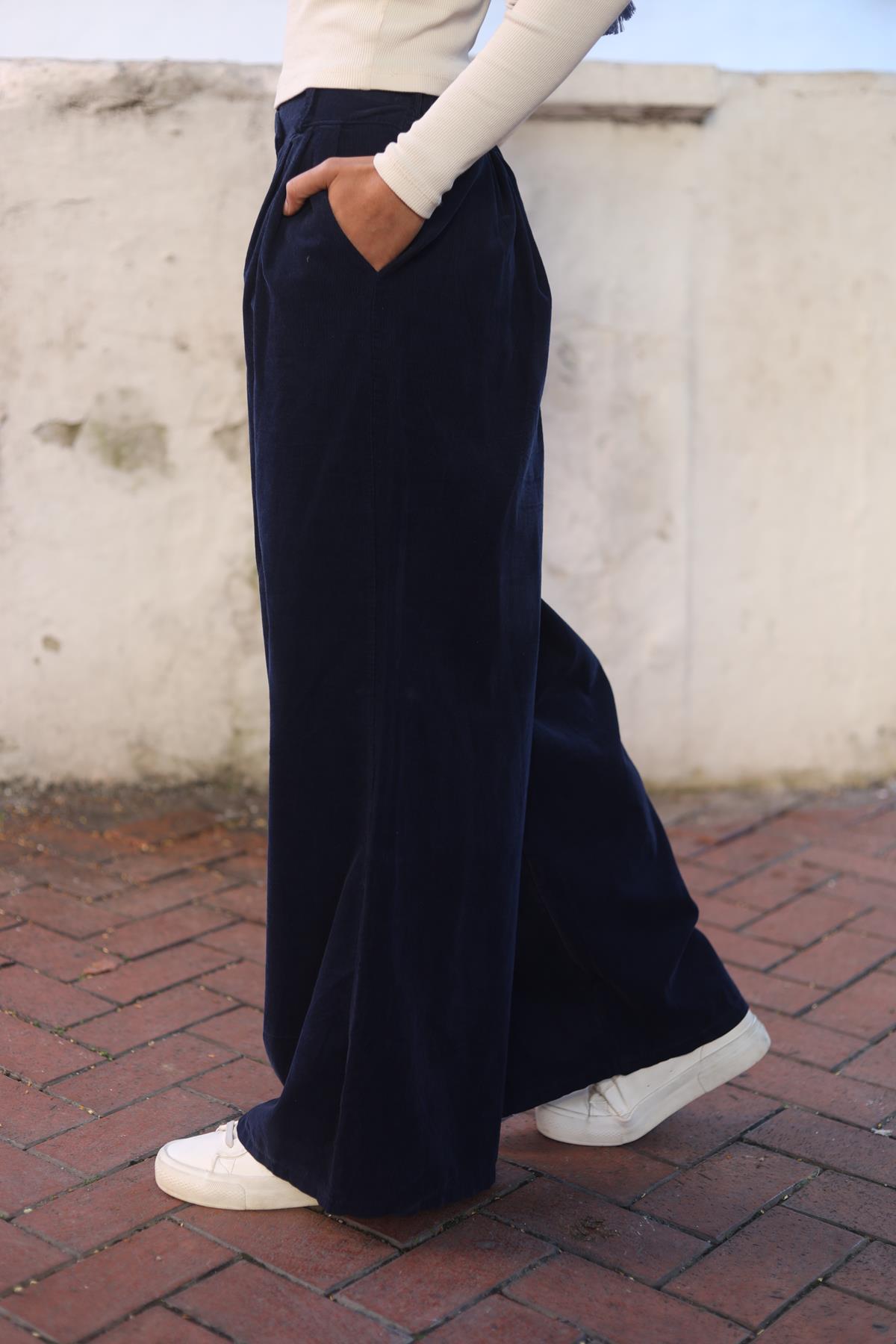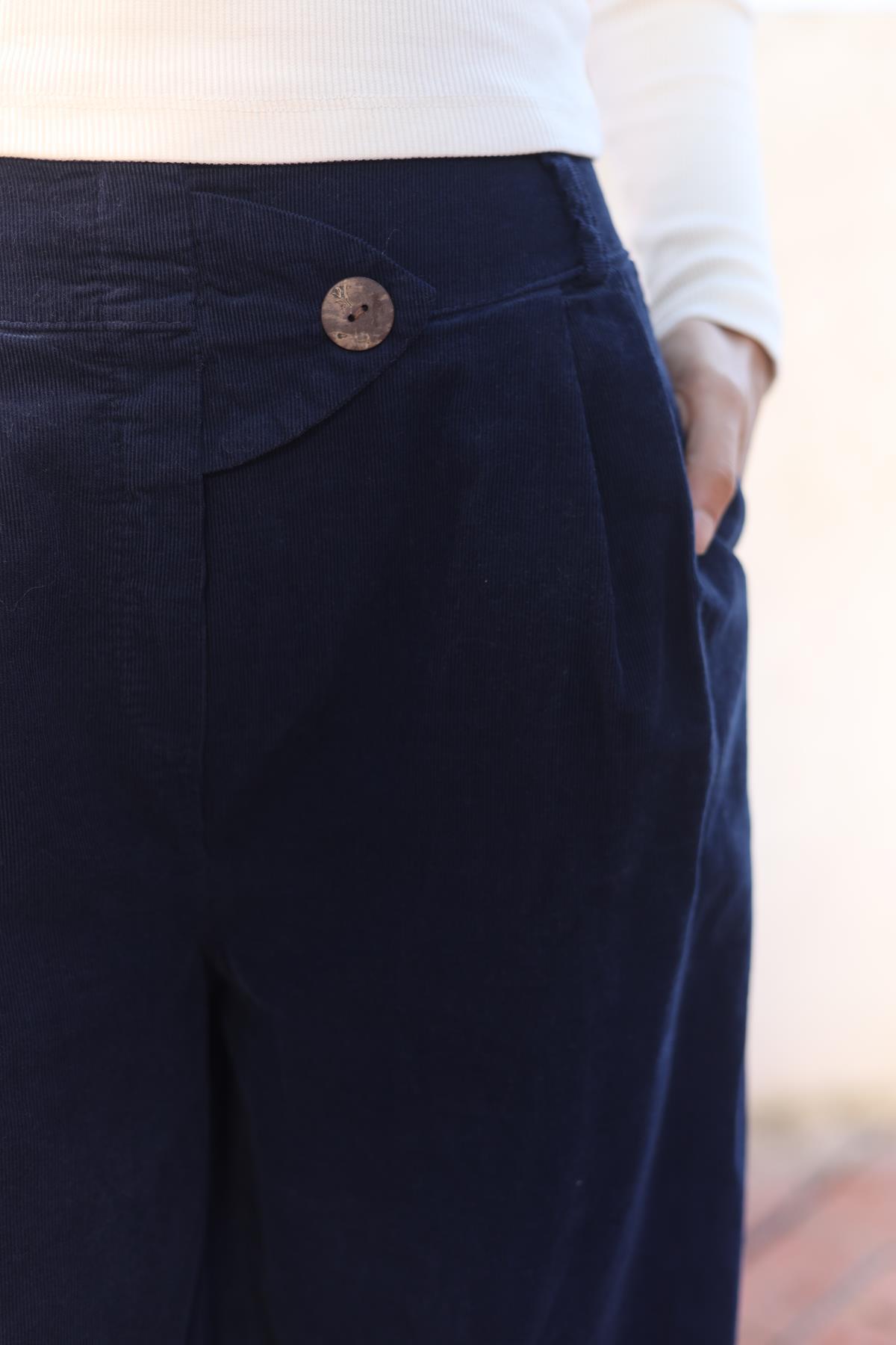 Lacivert Düğme Detaylı Kadife Pantolon