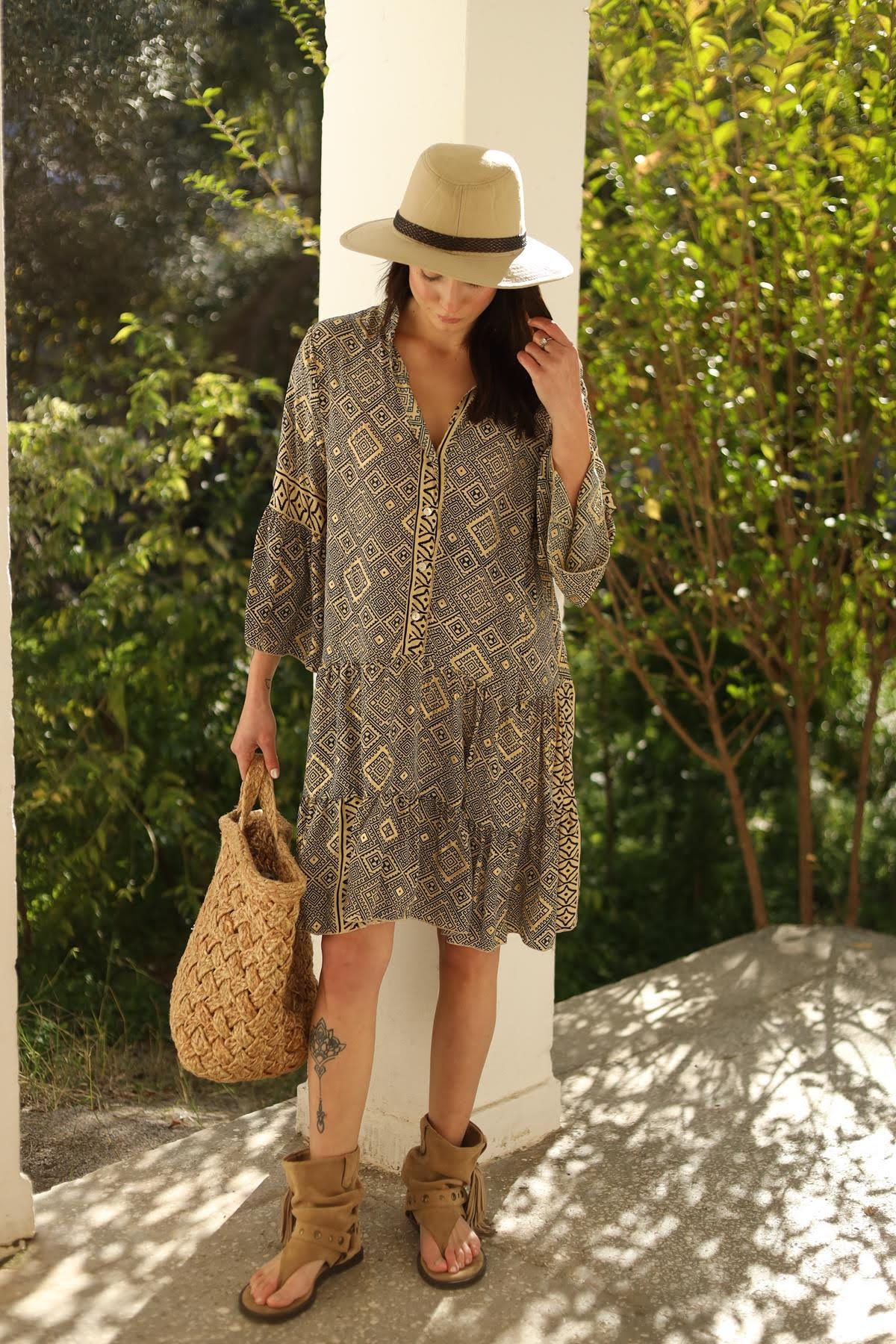 Lacivert Otantik Desenli Düğmeli İpek Elbise