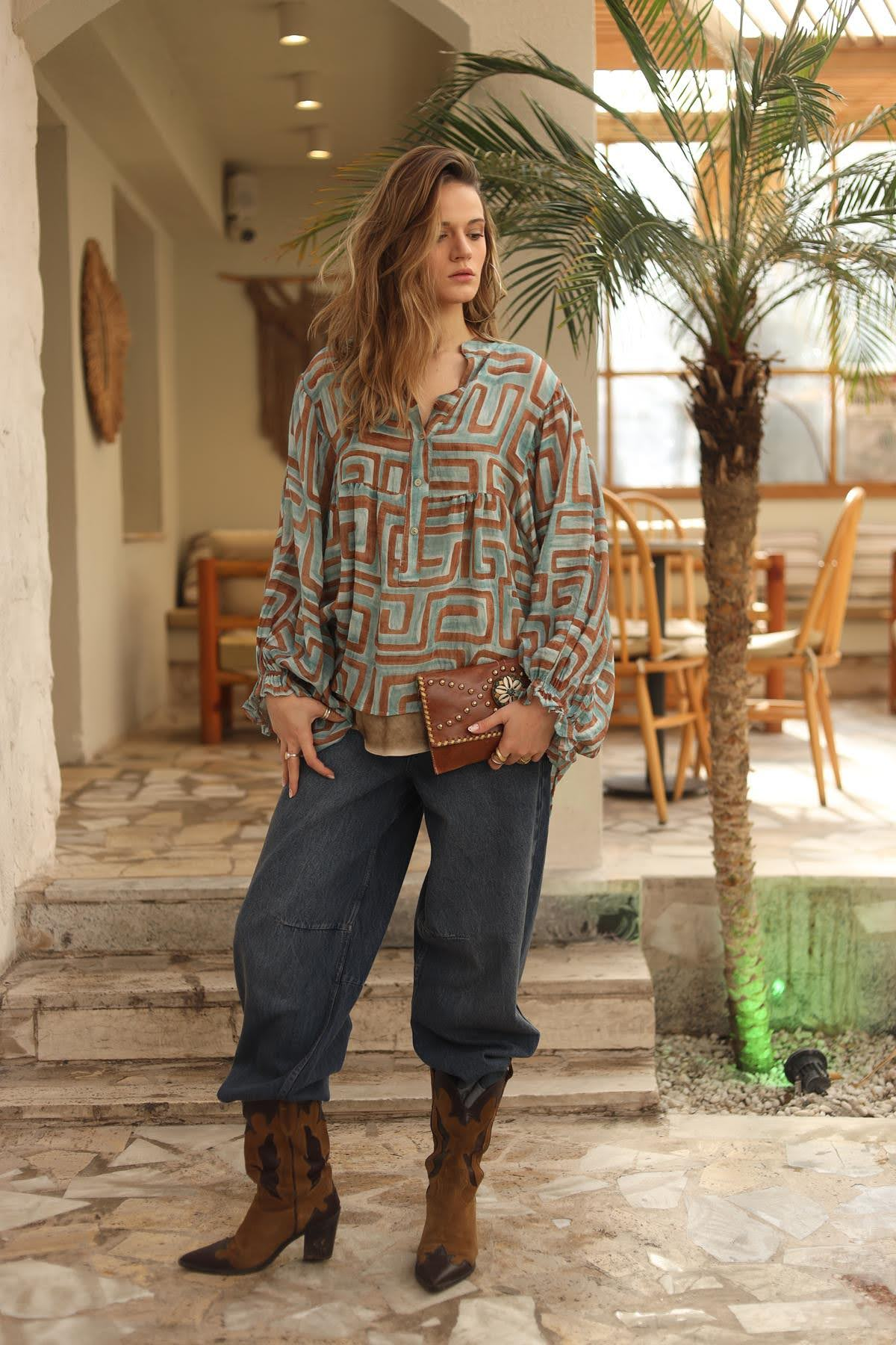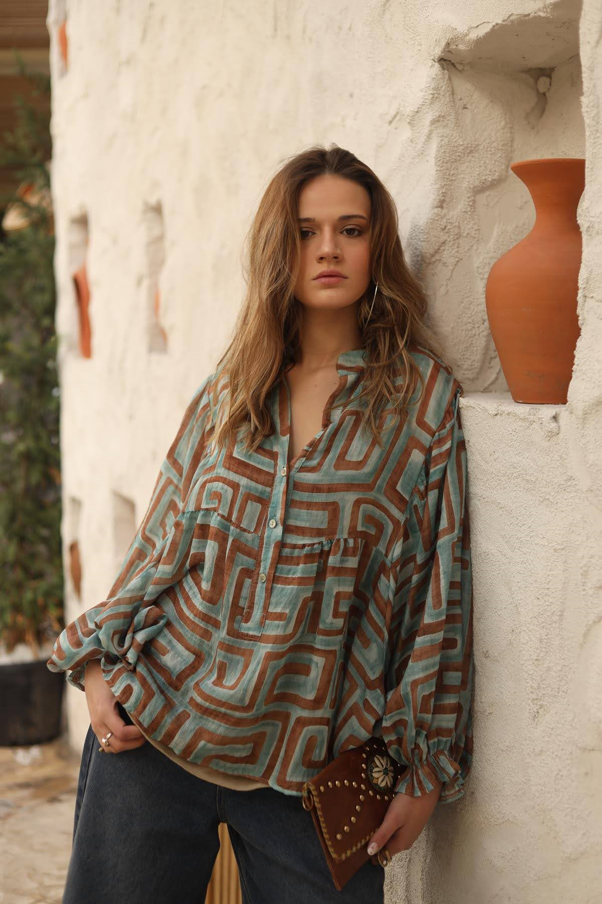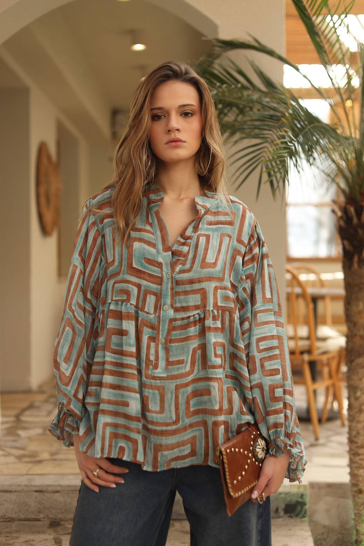 Mint Yeşili Desenli Yarasa Kol Düğmeli Bluz