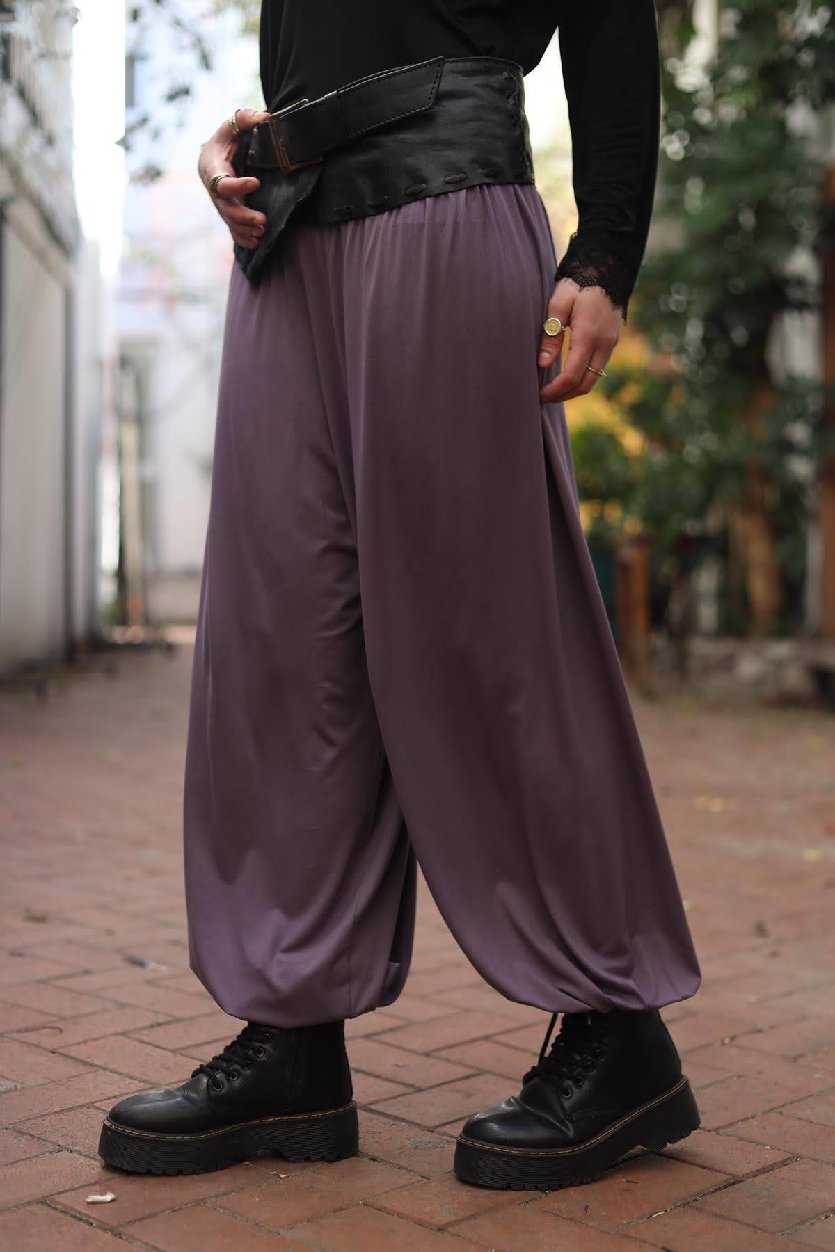 Mor Beli Drapeli Paçası Lastikli Şalvar Pantolon (KP-LAM-006-VI-MO1-STD)