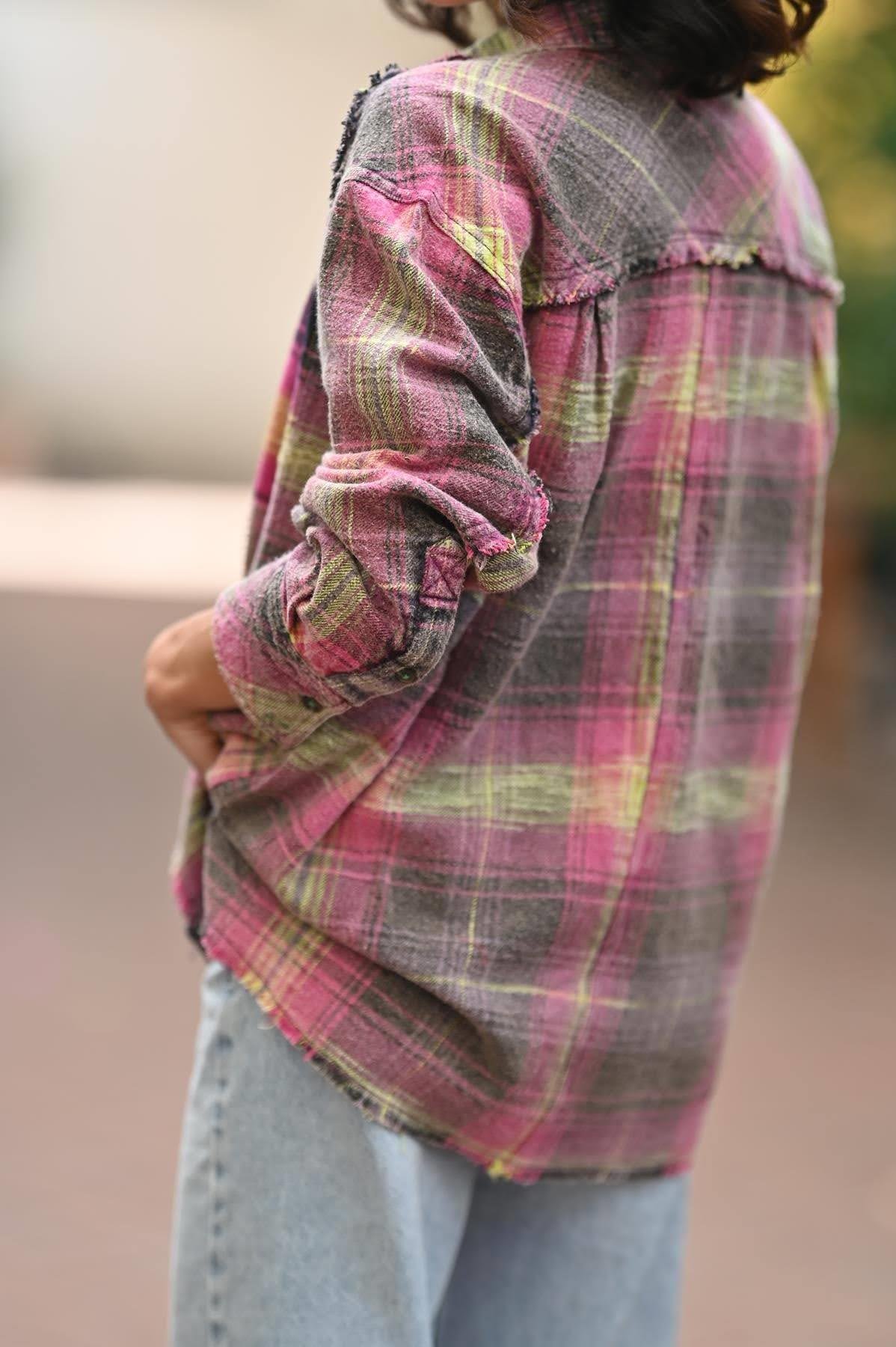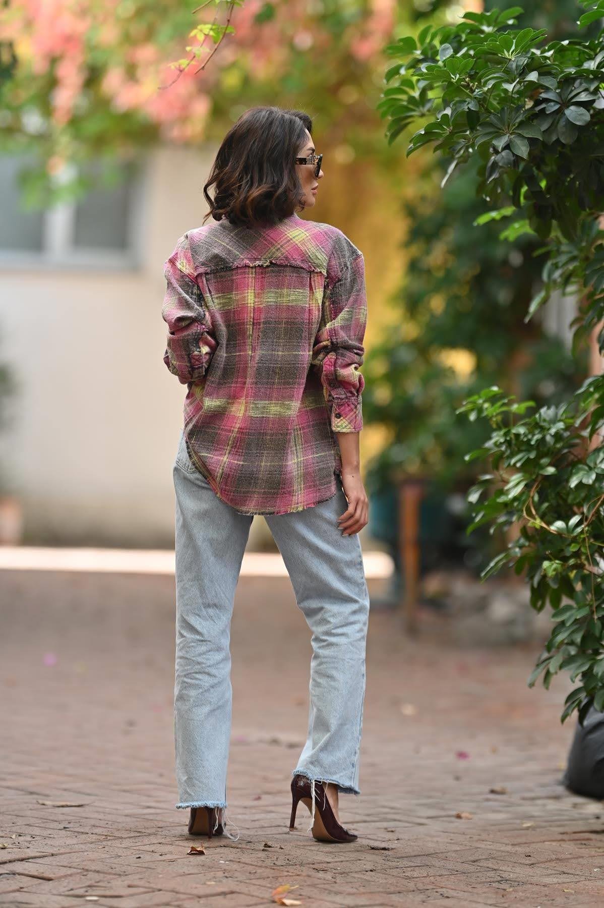 Pembe Eskitme Ekose Cepli Oduncu Gömlek