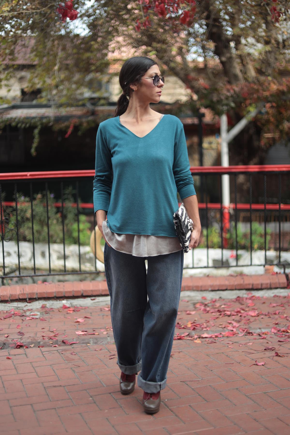 Petrol Mavisi Yumuşak Doku V Yaka Bluz