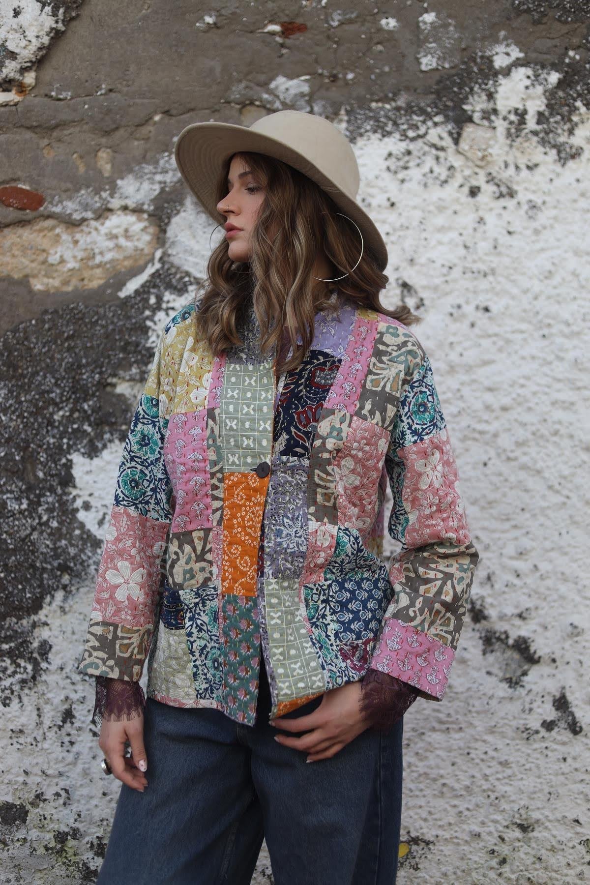 Renkli Tek Düğmeli Çoban Dikişli Patchwork Ceket
