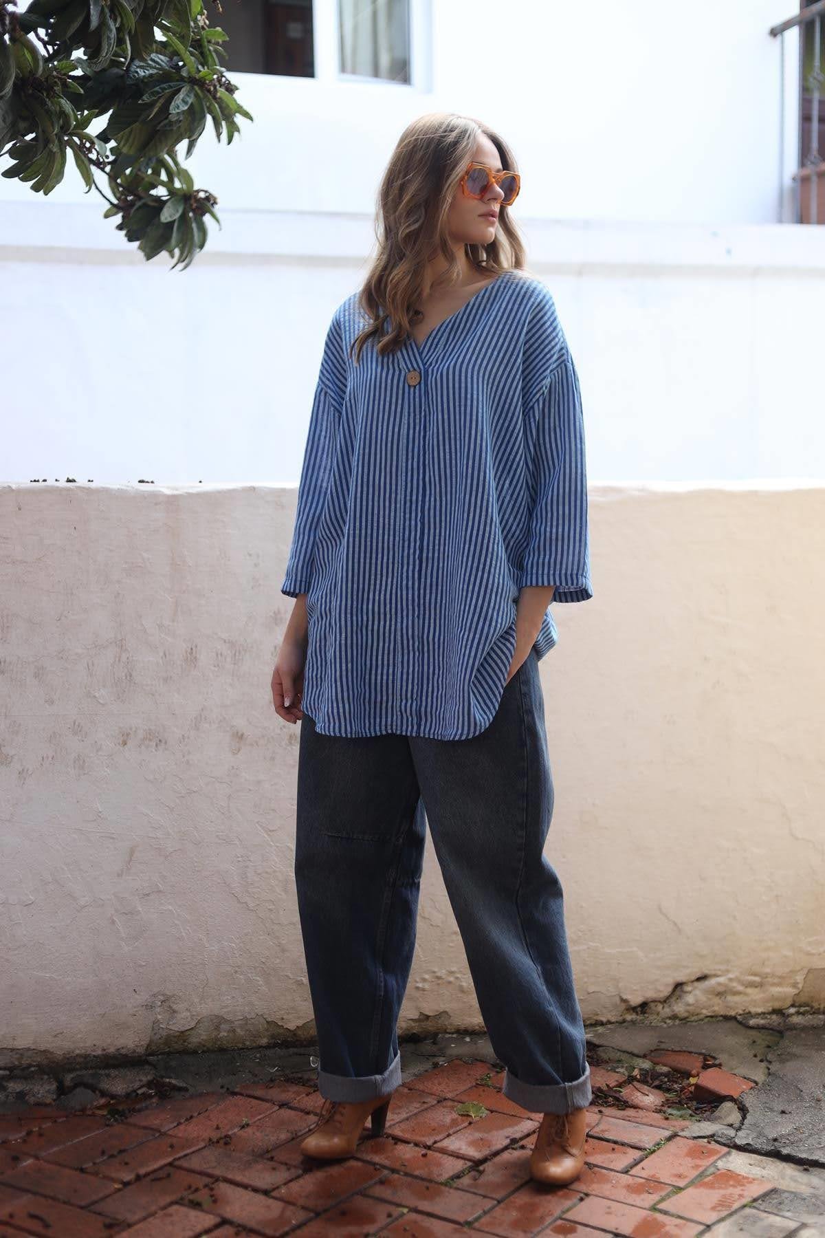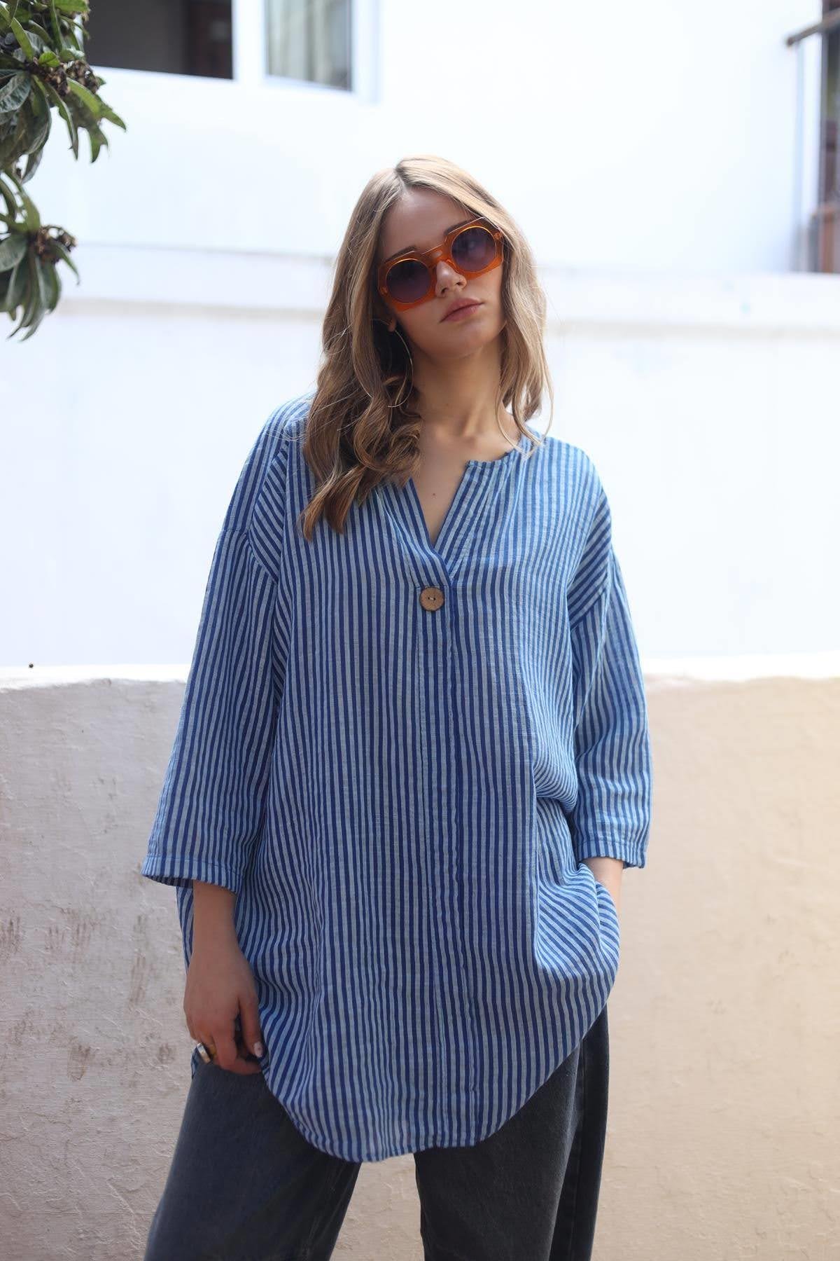 Saks Mavisi Çizgili Tek Düğmeli Tunik