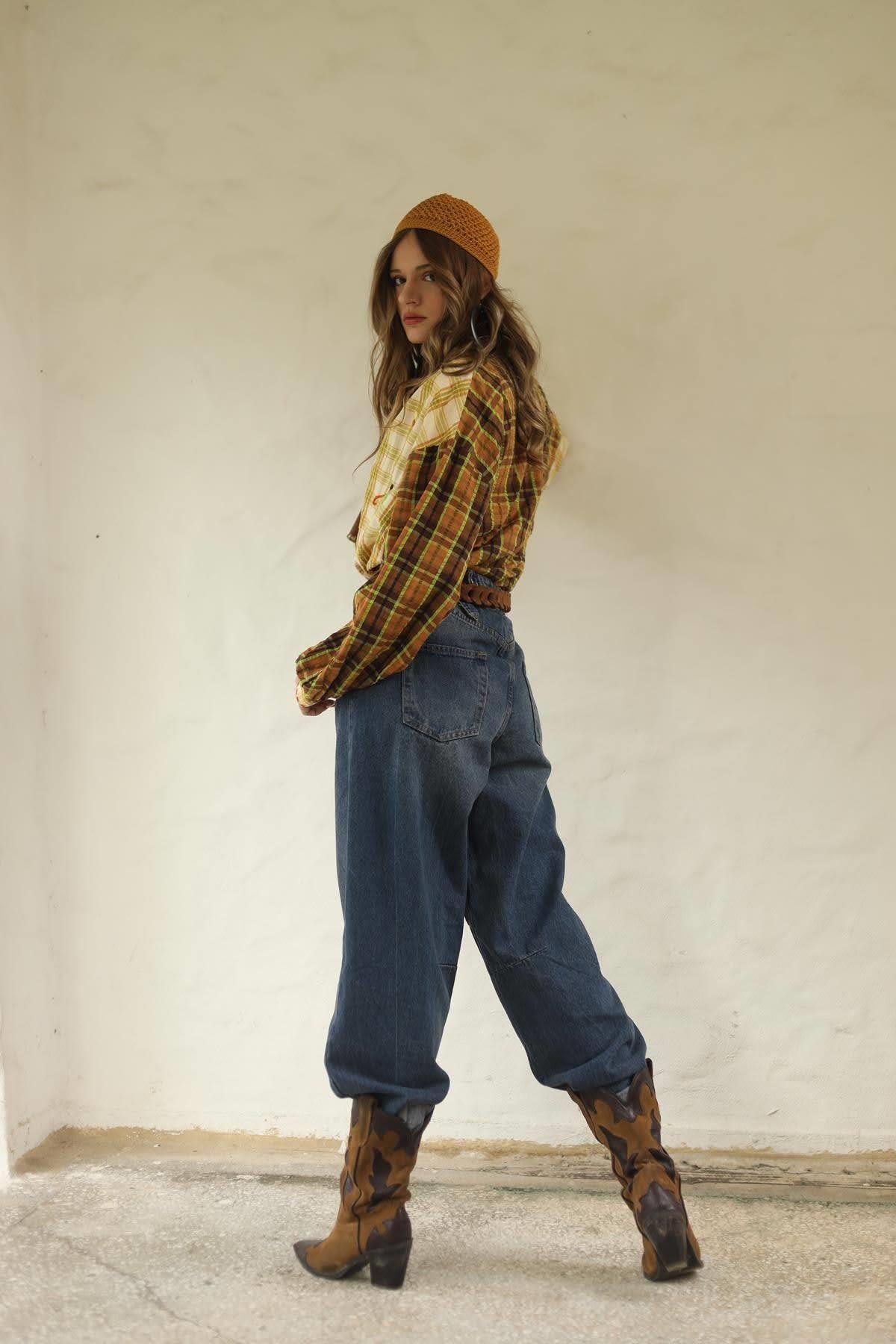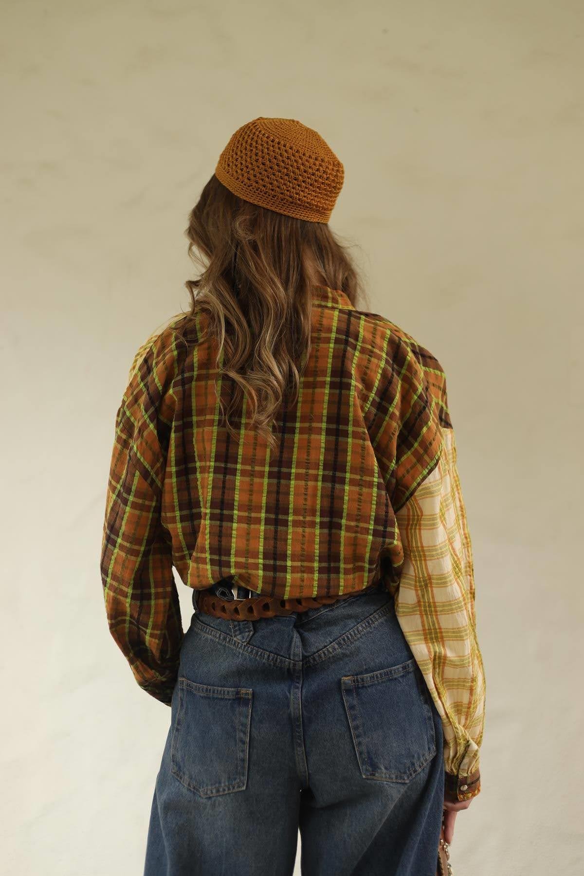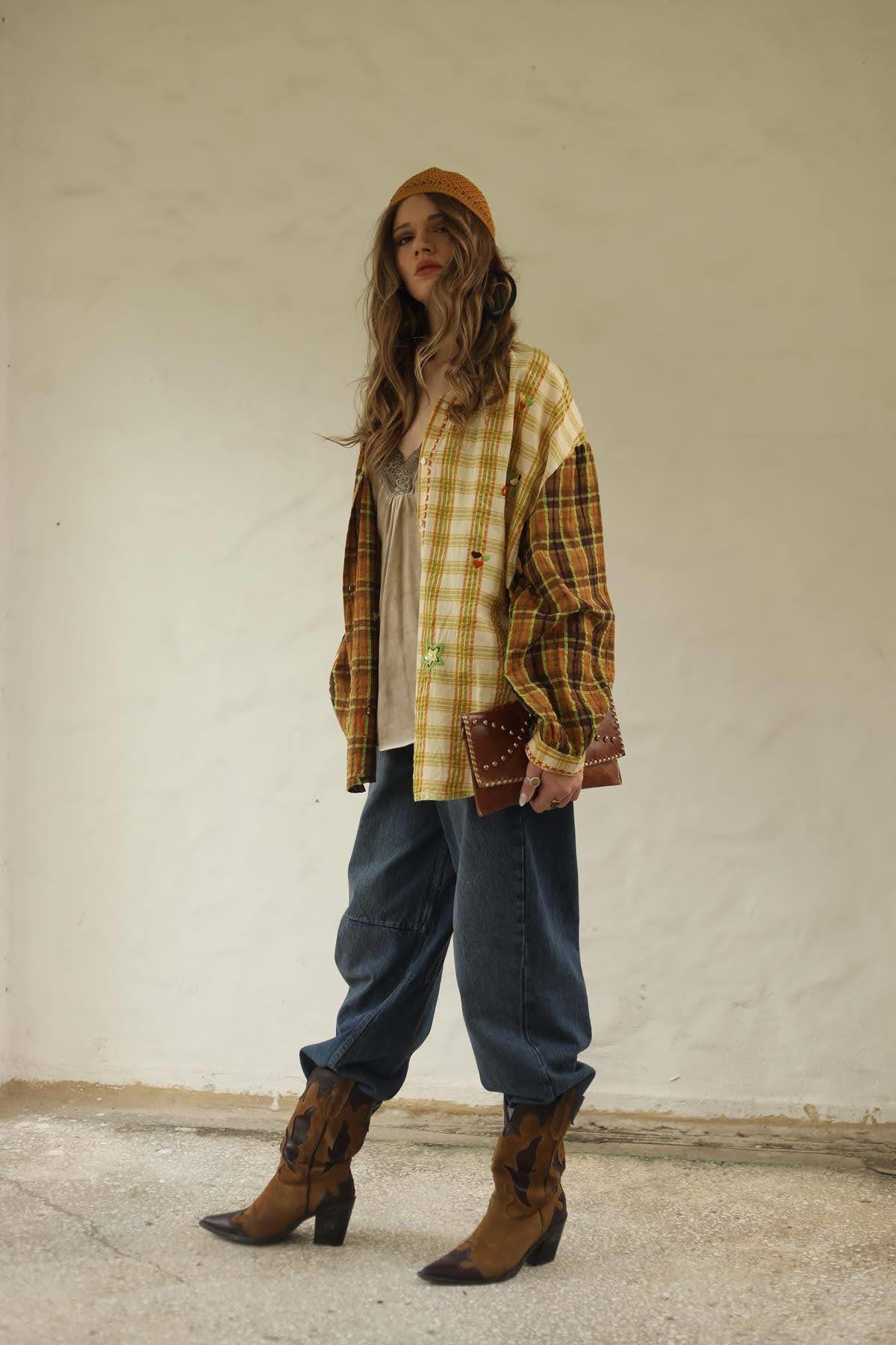 Sarı Pul Detaylı İşlemeli Ekose Gömlek
