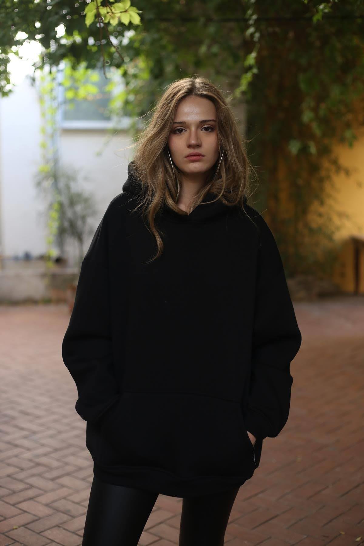Siyah Arkası Yazılı Kanguru Cepli Sweatshirt