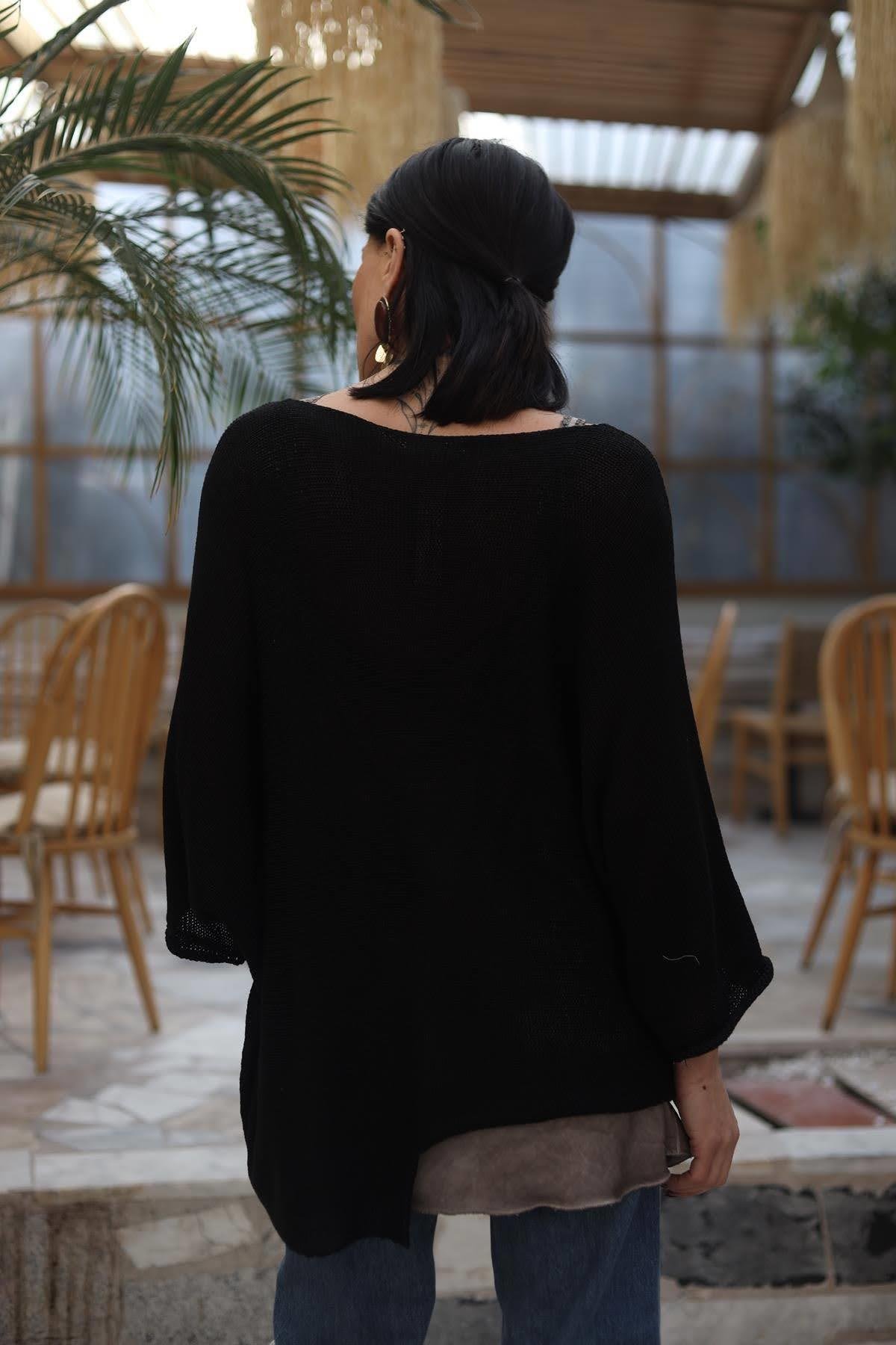 Siyah Asimetrik Kesim Cepli Triko Bluz