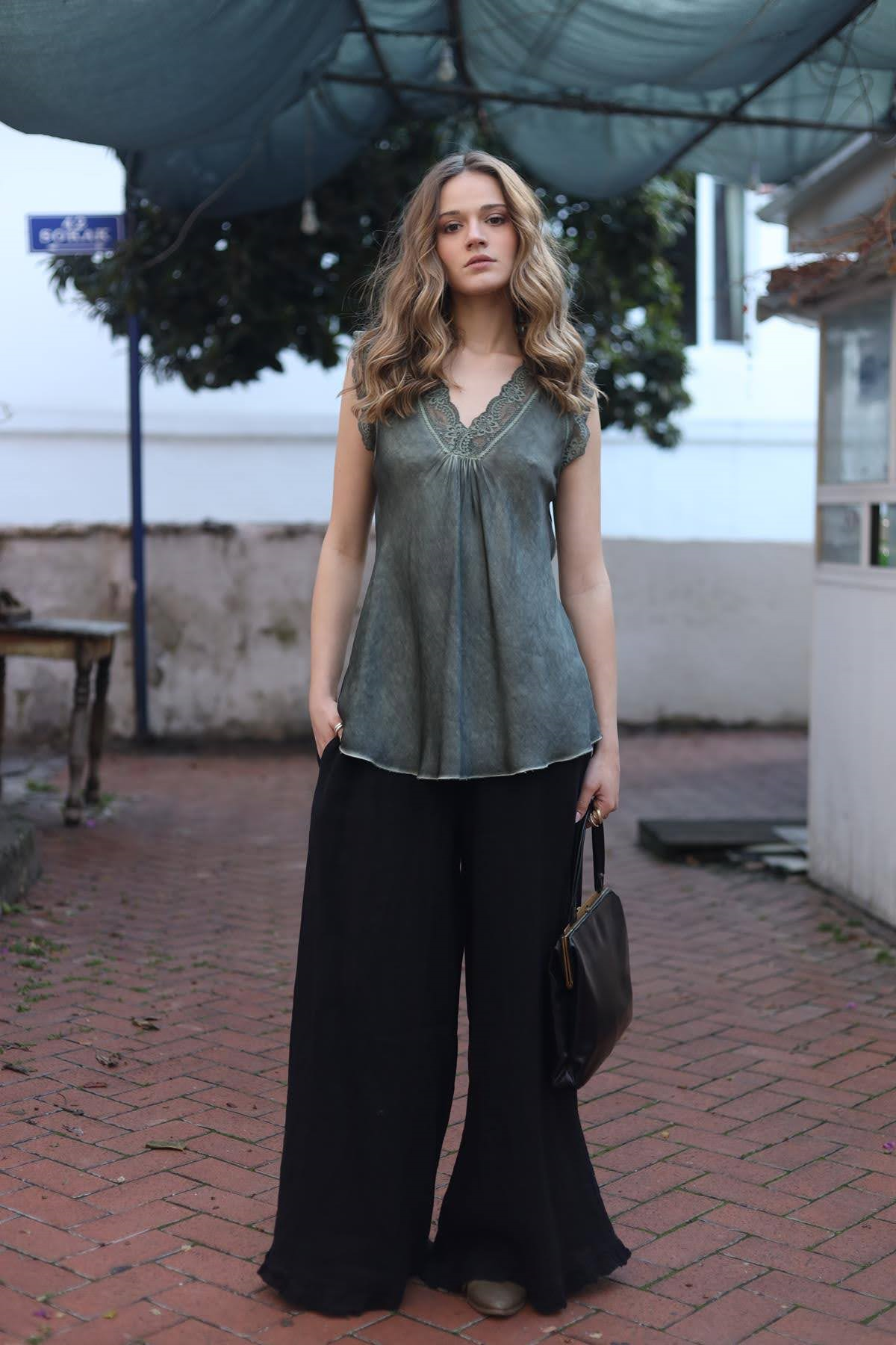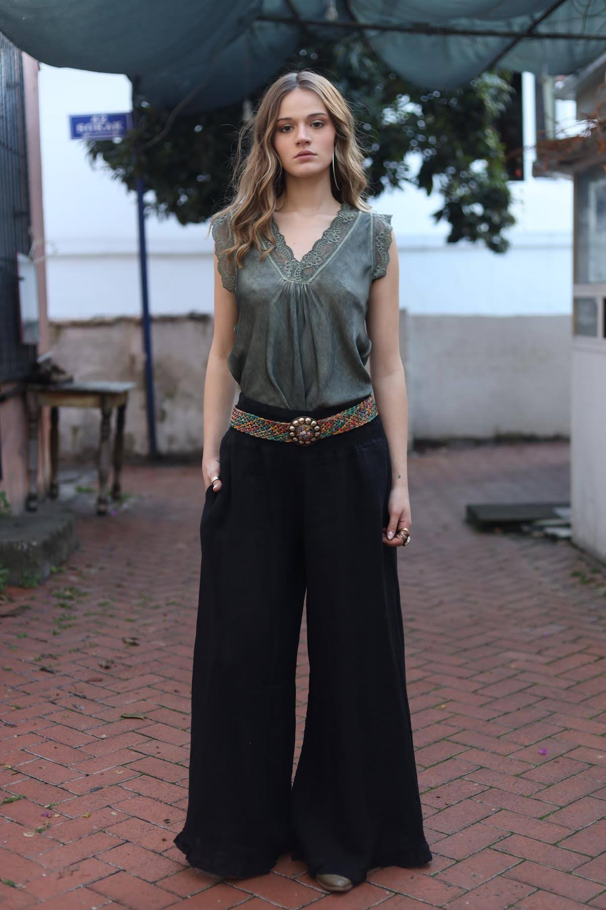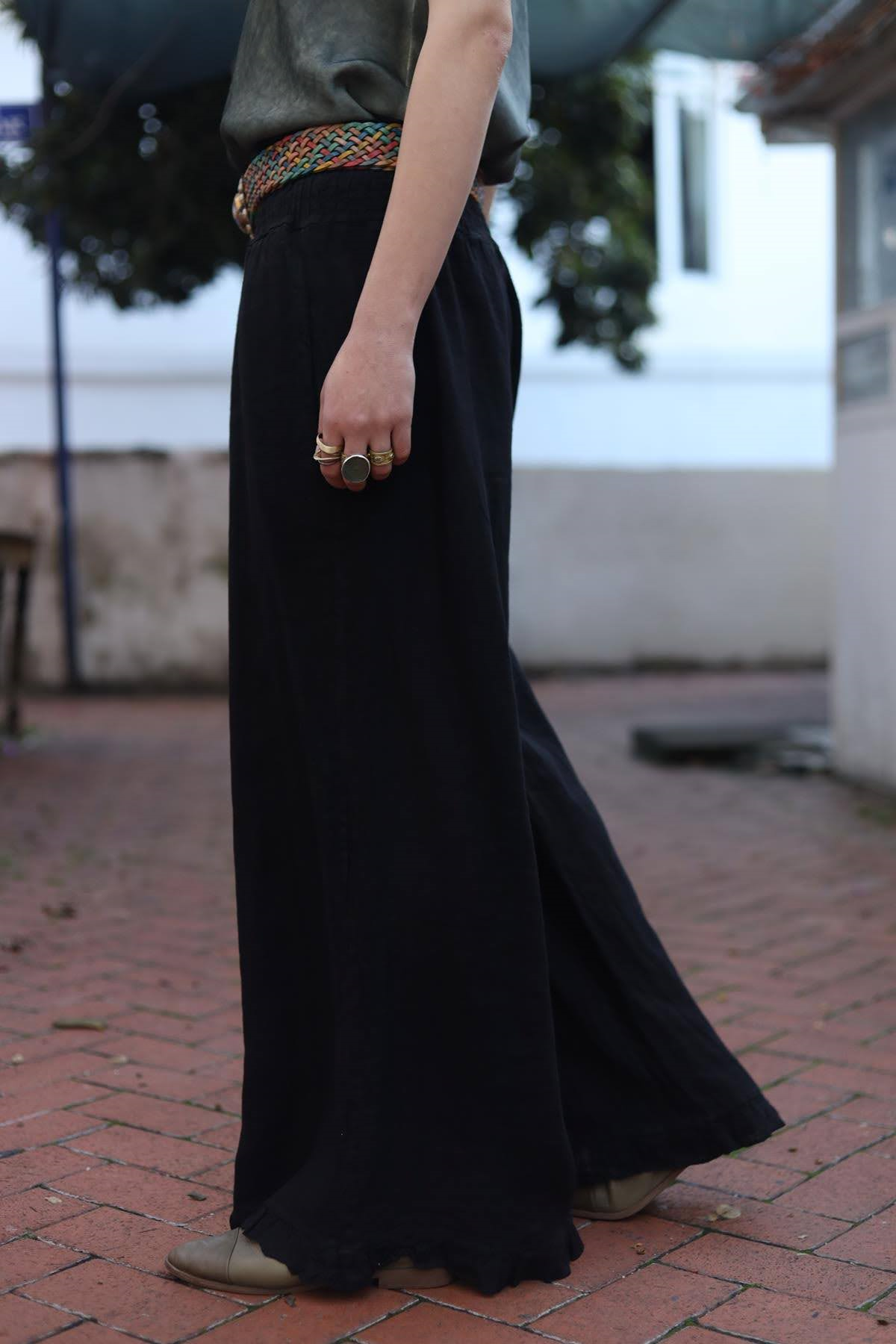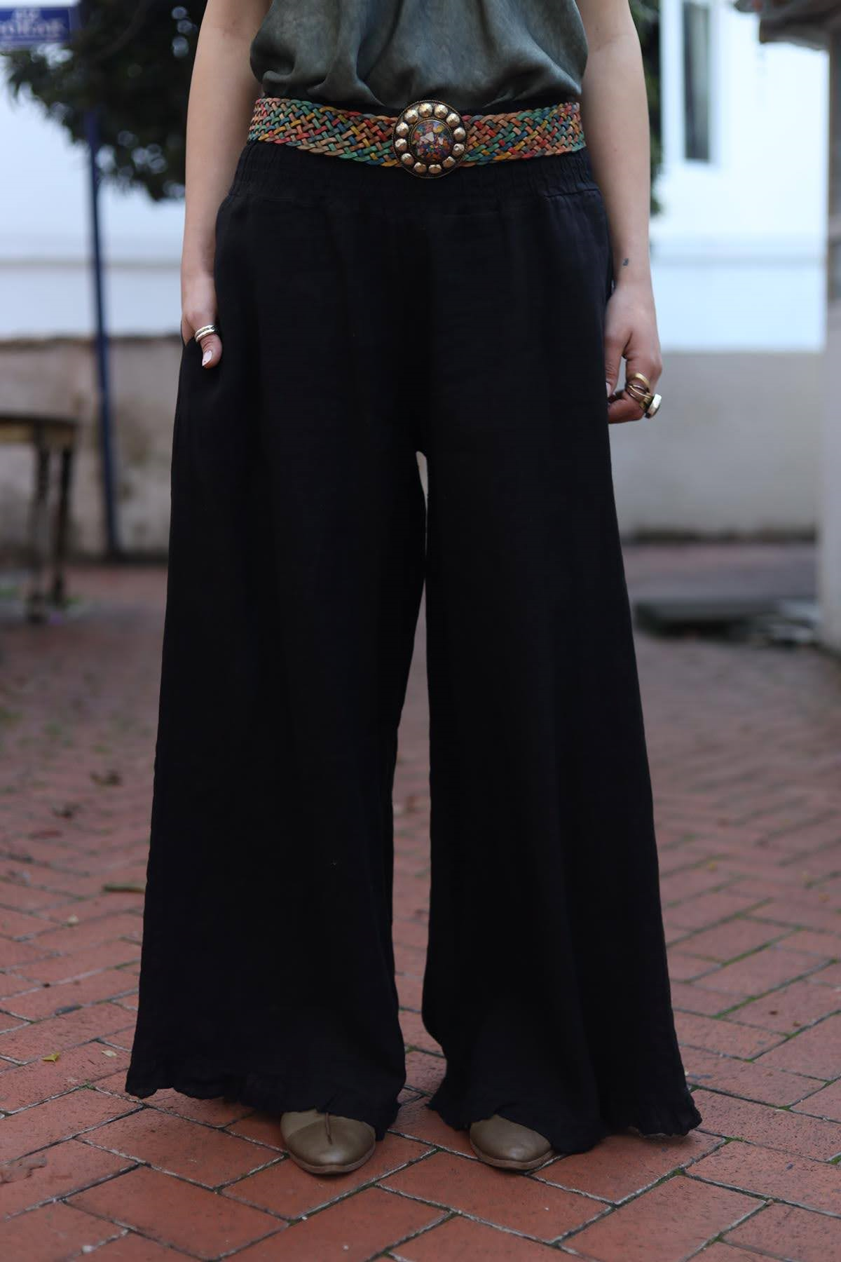 Siyah Beli Gipeli Paça Detaylı Keten Pantolon
