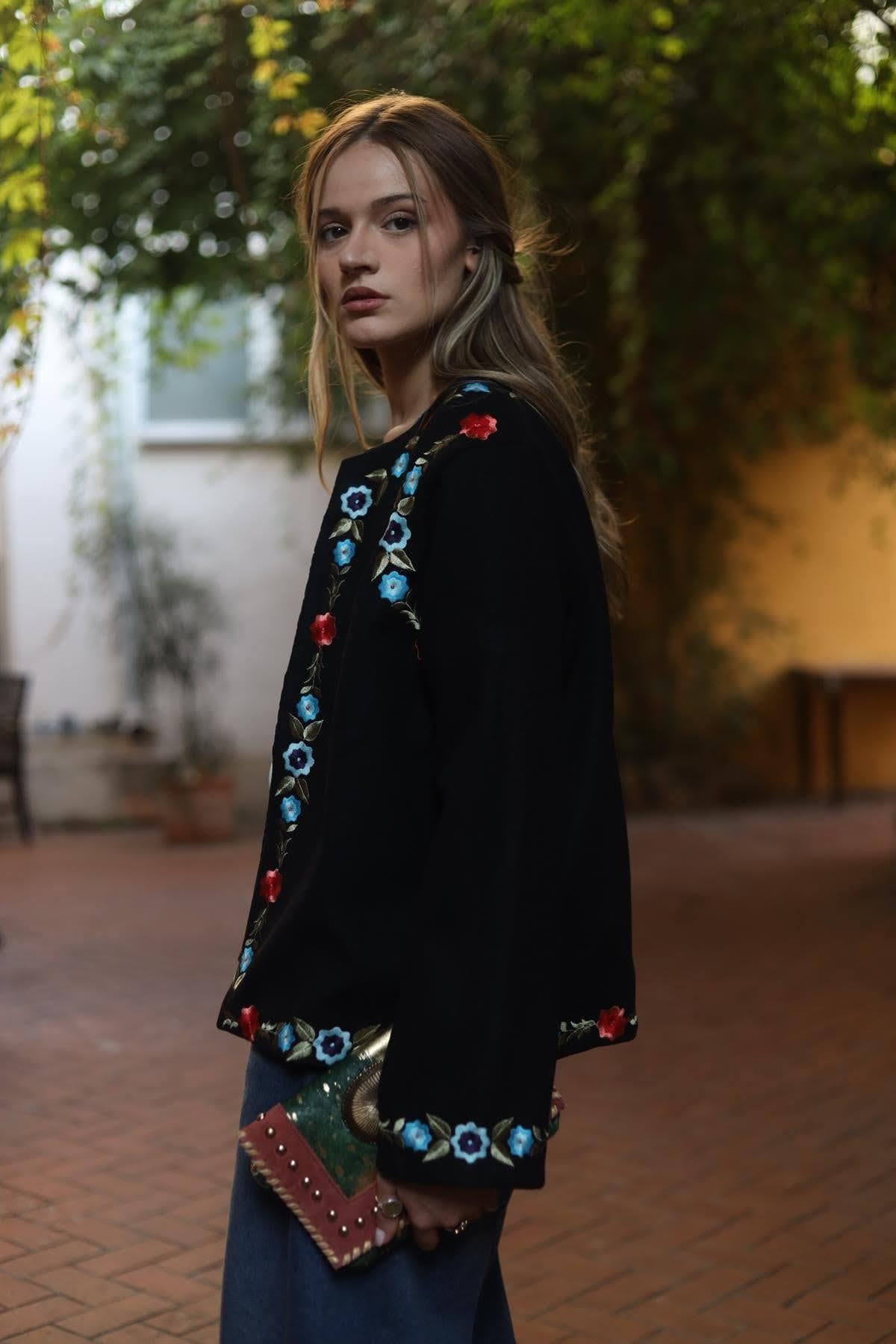 Siyah Çiçek Nakışlı Kaşe Ceket