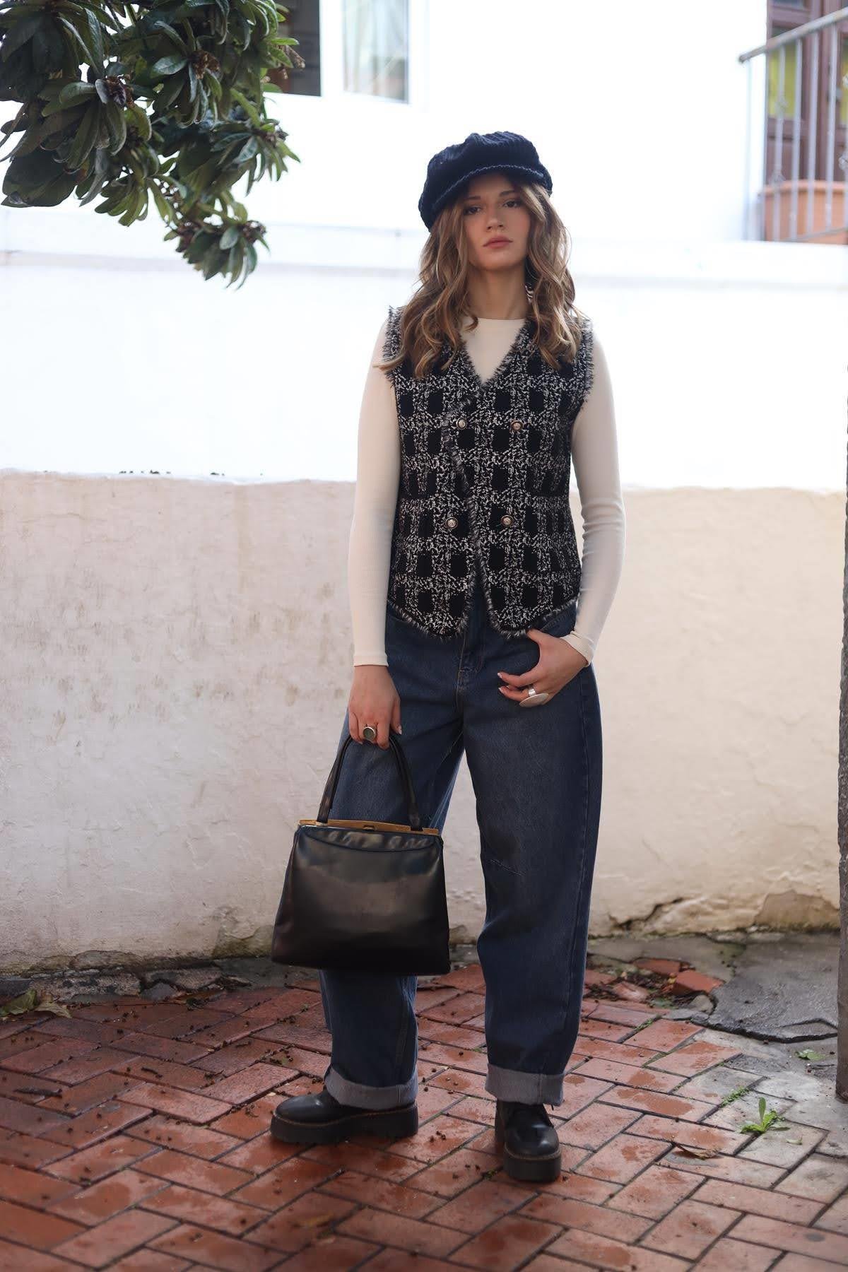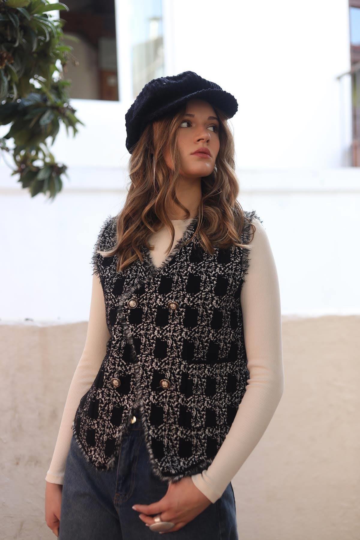 Siyah Desenli Yumuşak Triko Yelek