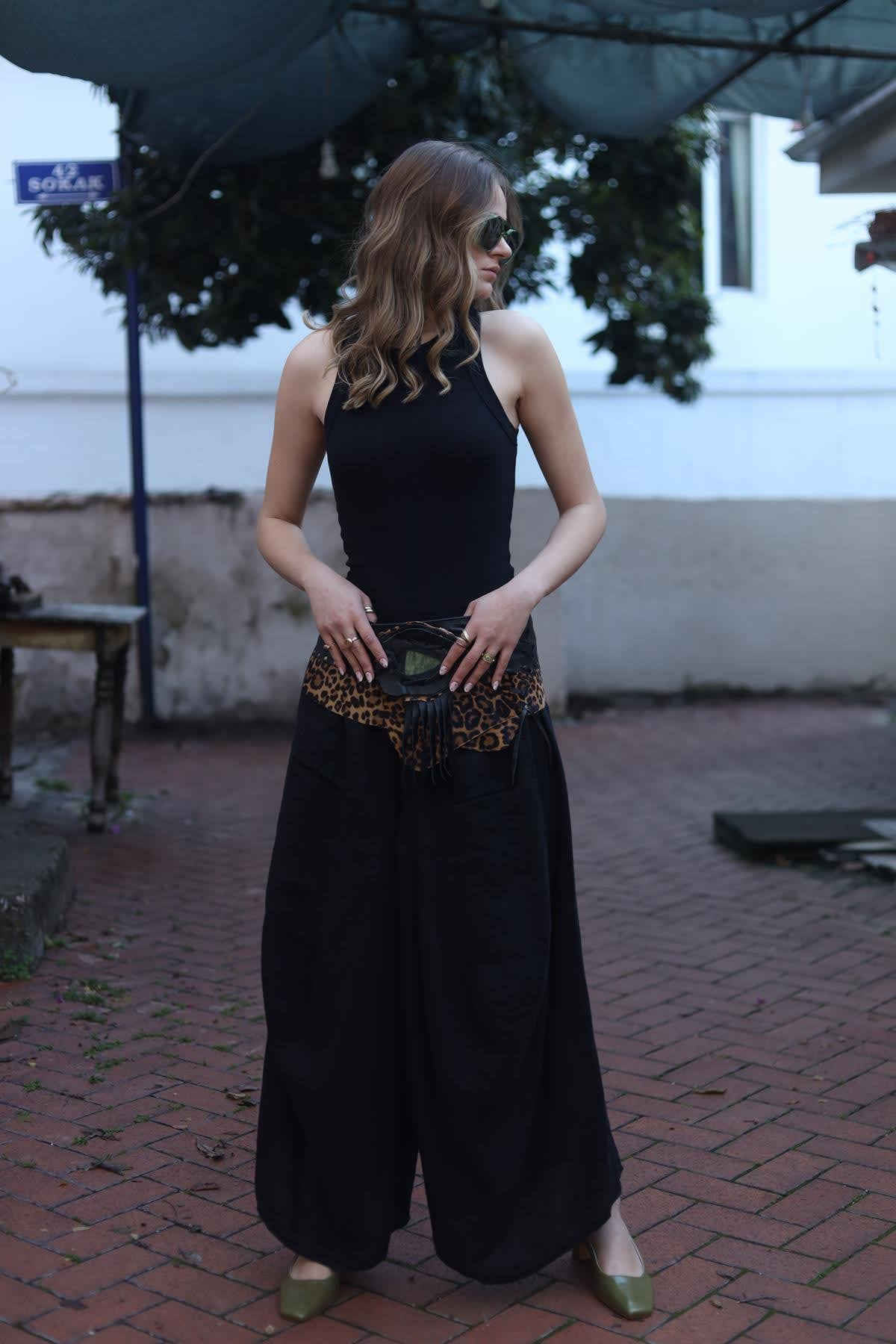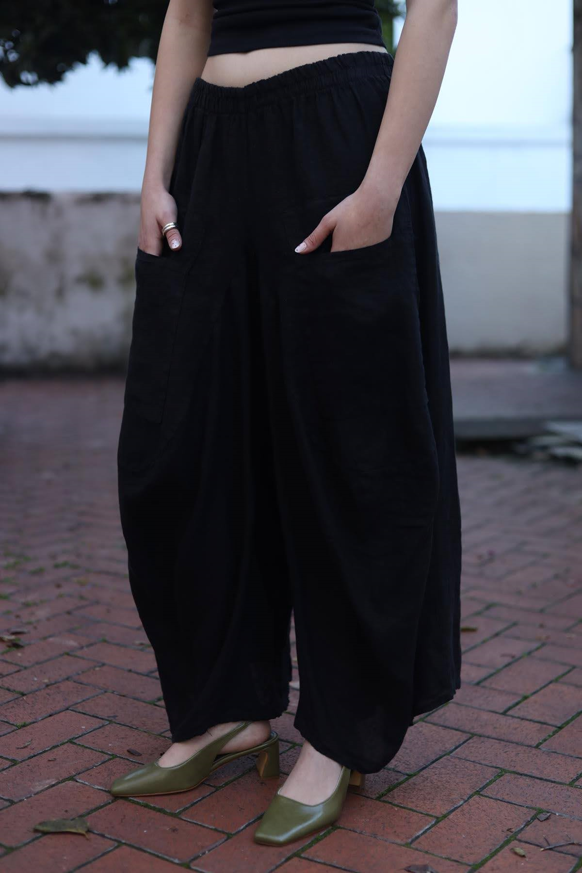 Siyah Önü Cepli Keten Şalvar