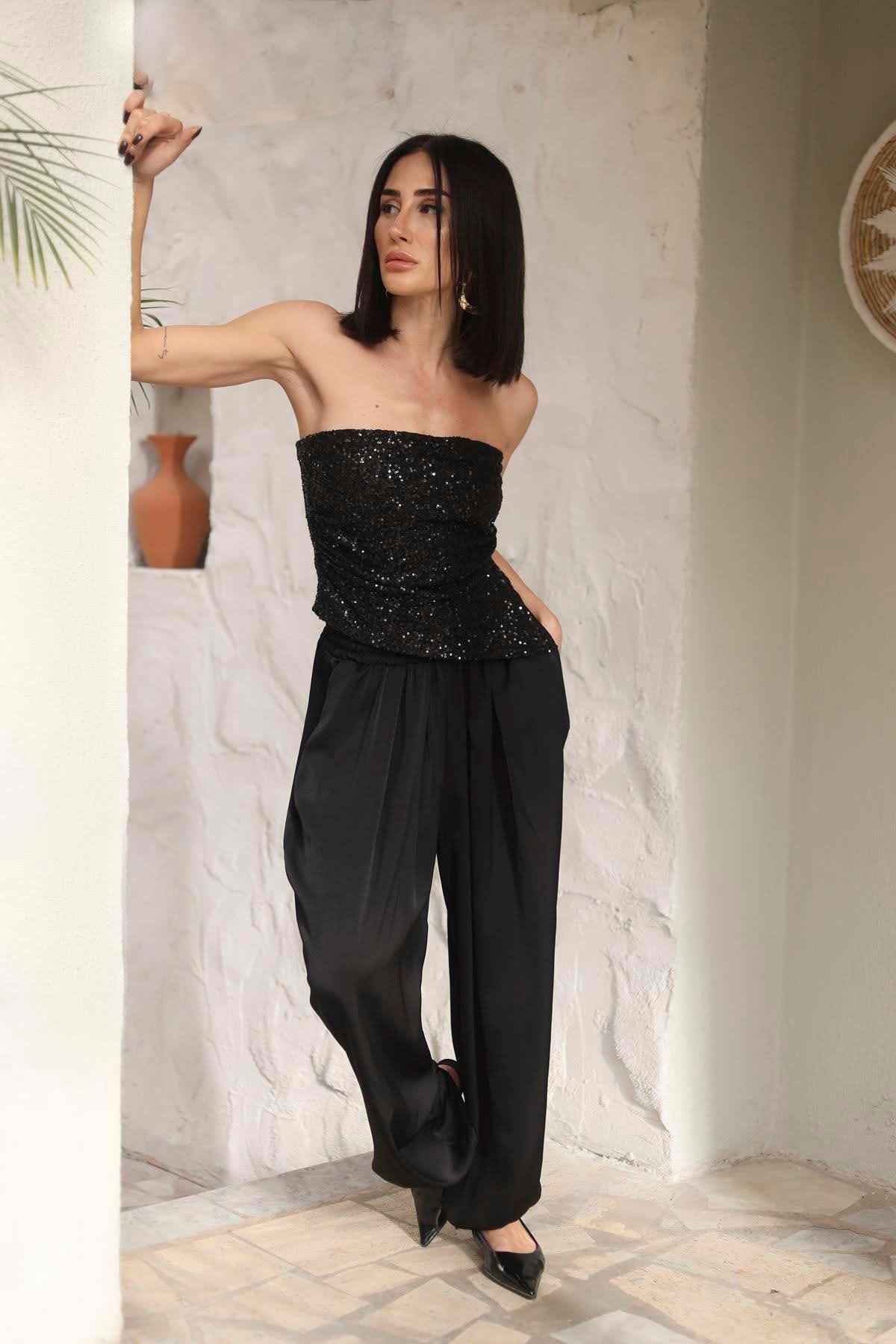 Siyah Paçası Pensli Saten Pantolon (KP-MSN-002-STN-SI-S)