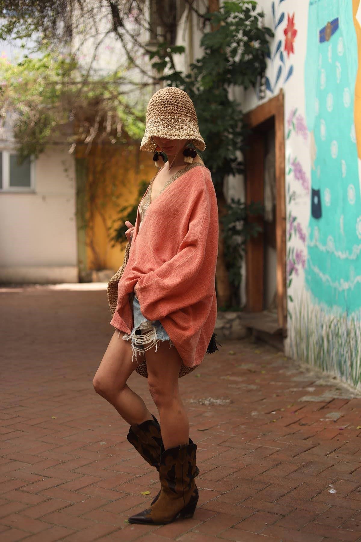 Somon Rengi Tek Düğme Keten Hırka (KH-FAL-002-KTN-SO-STD)