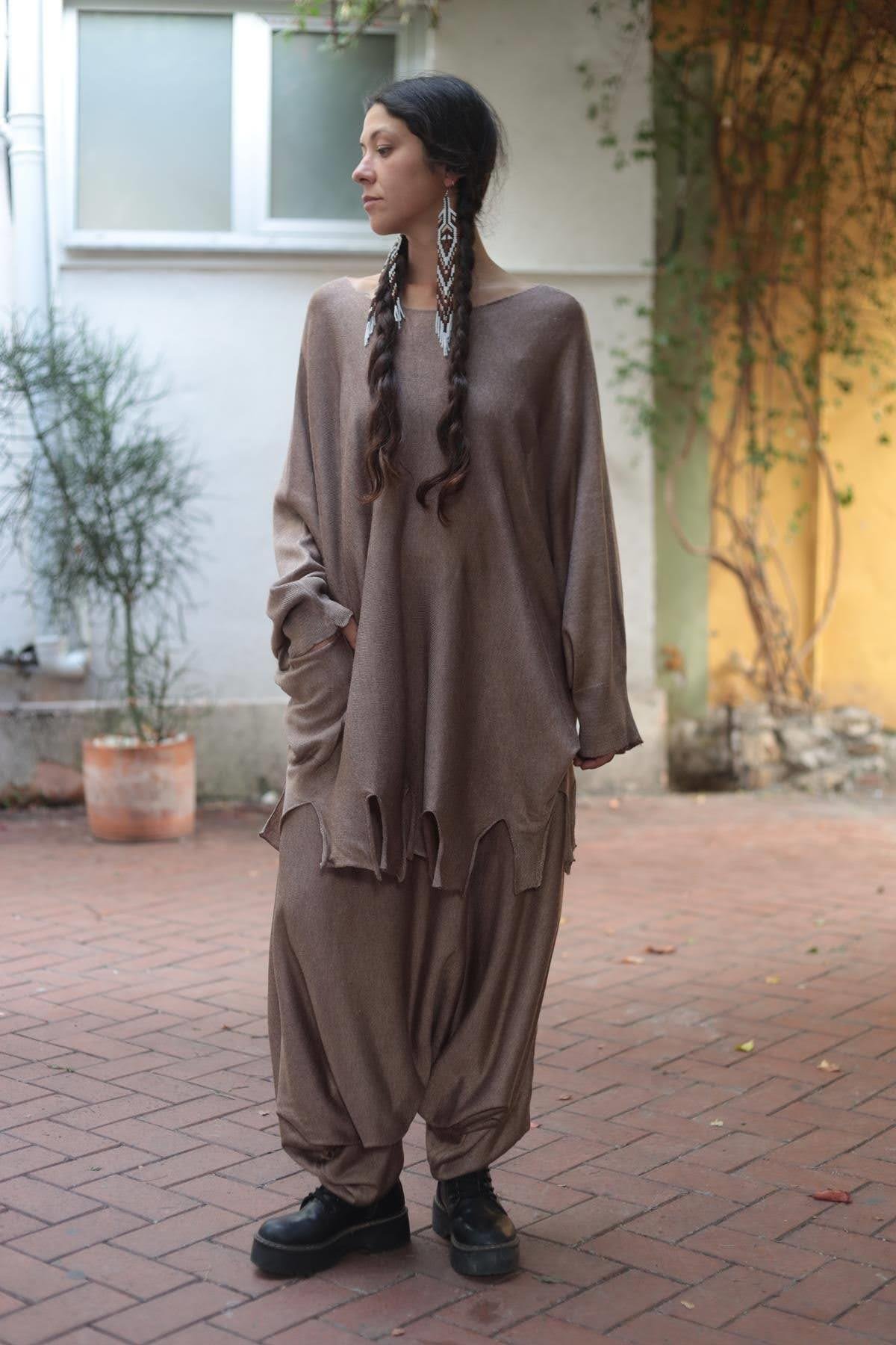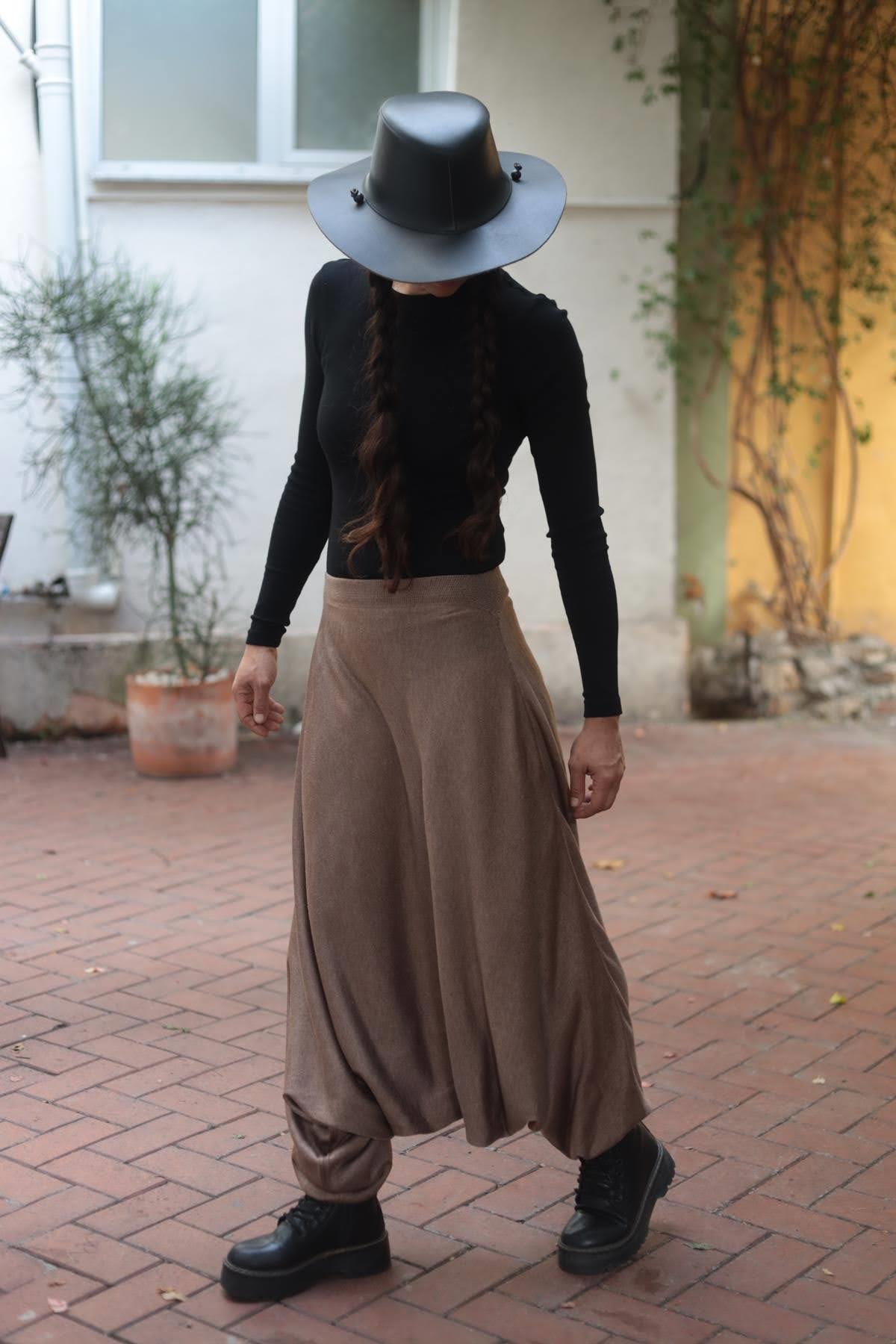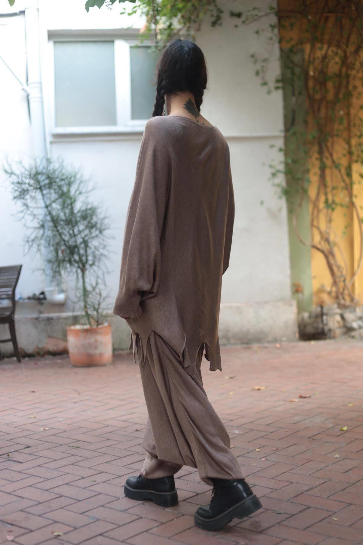 Sütlü Kahve Beli ve Paçası Lastikli Triko Şalvar (KS-LAM-005-AK-SKA-STD)