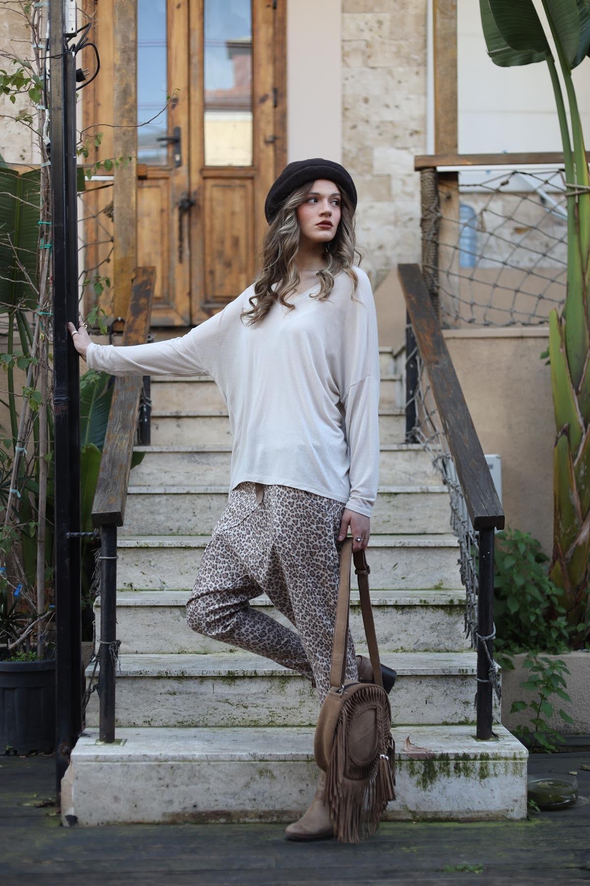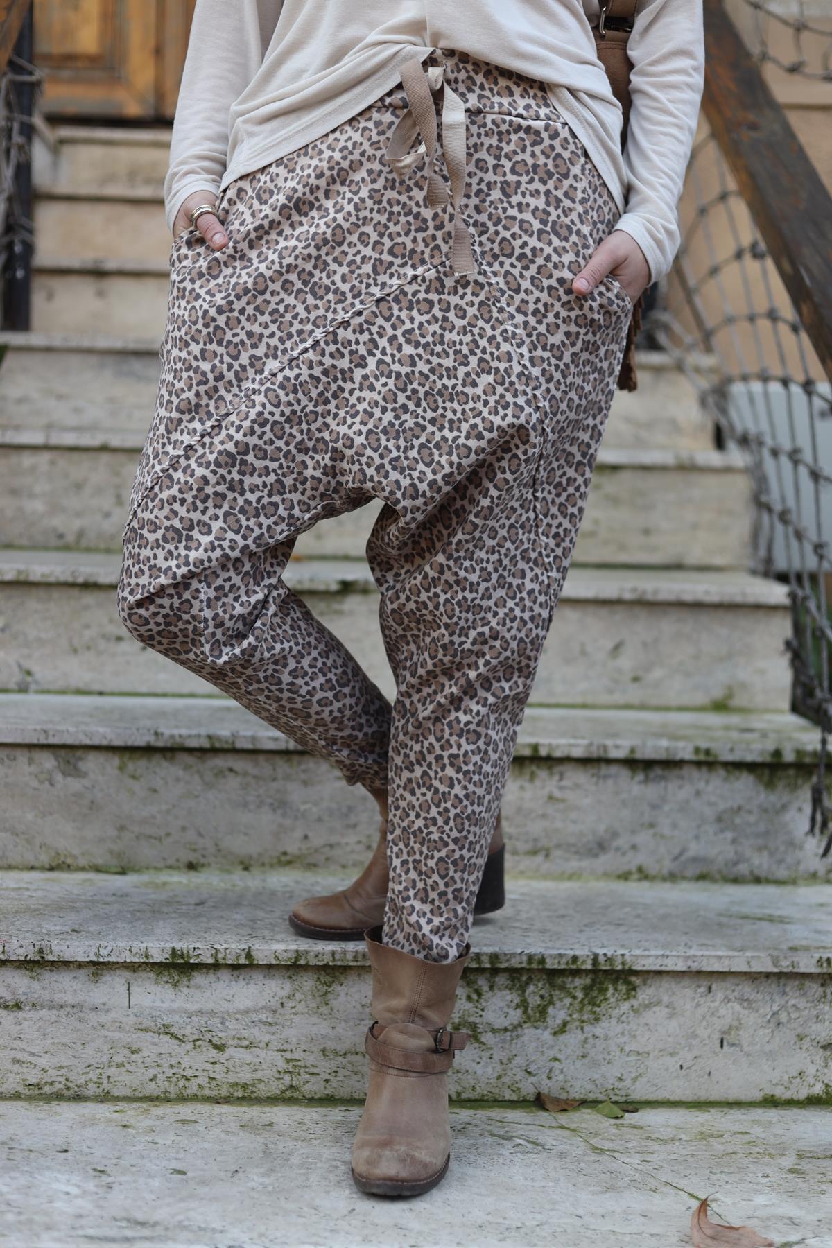 Sütlü Kahve Leopar Desenli Önü Dikişli Pantolon