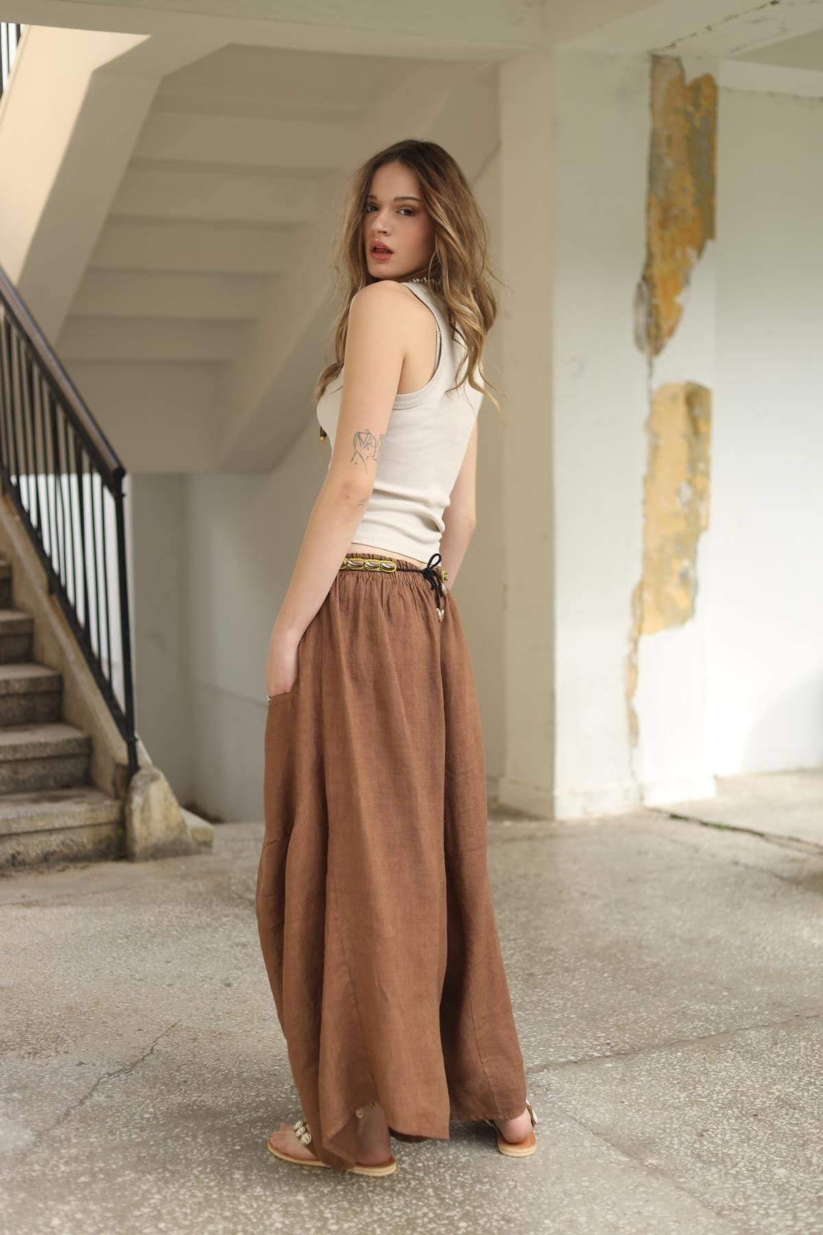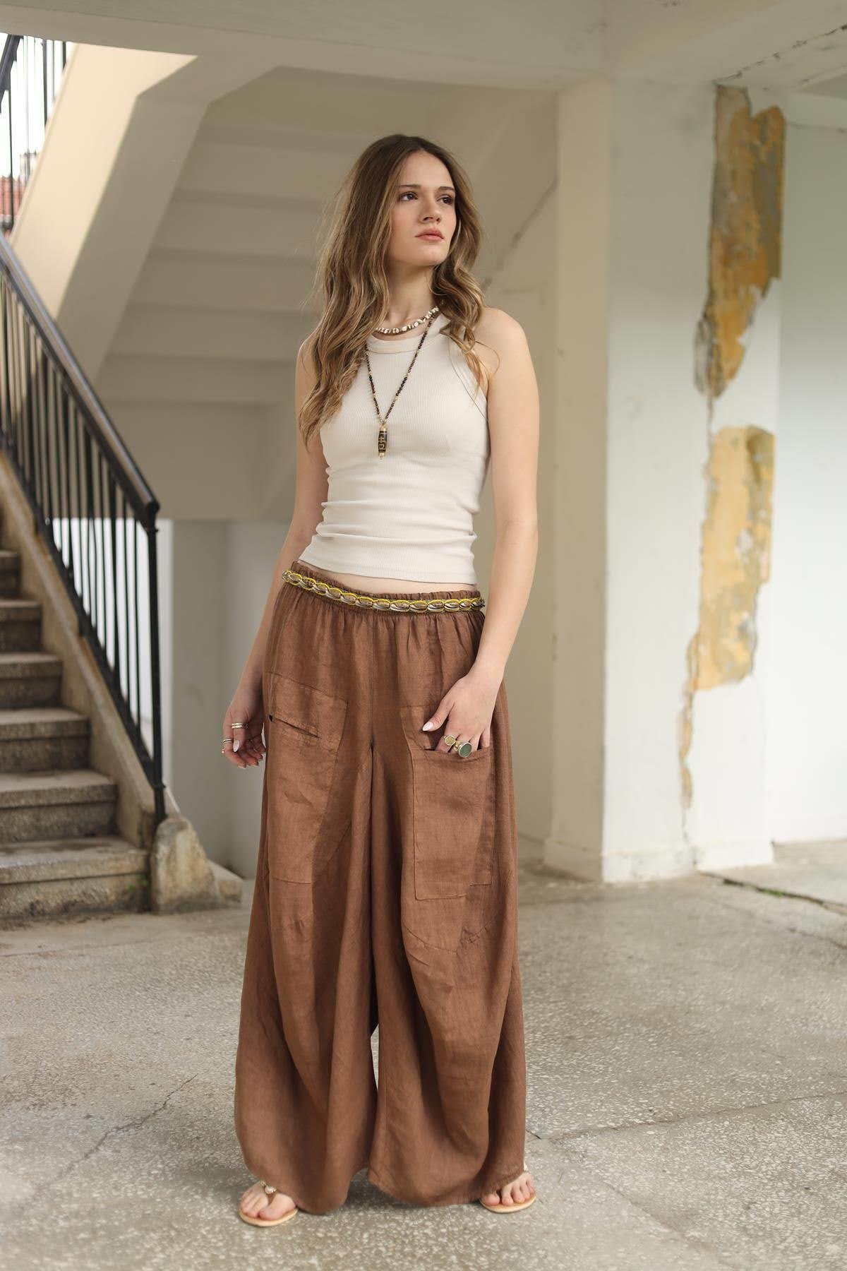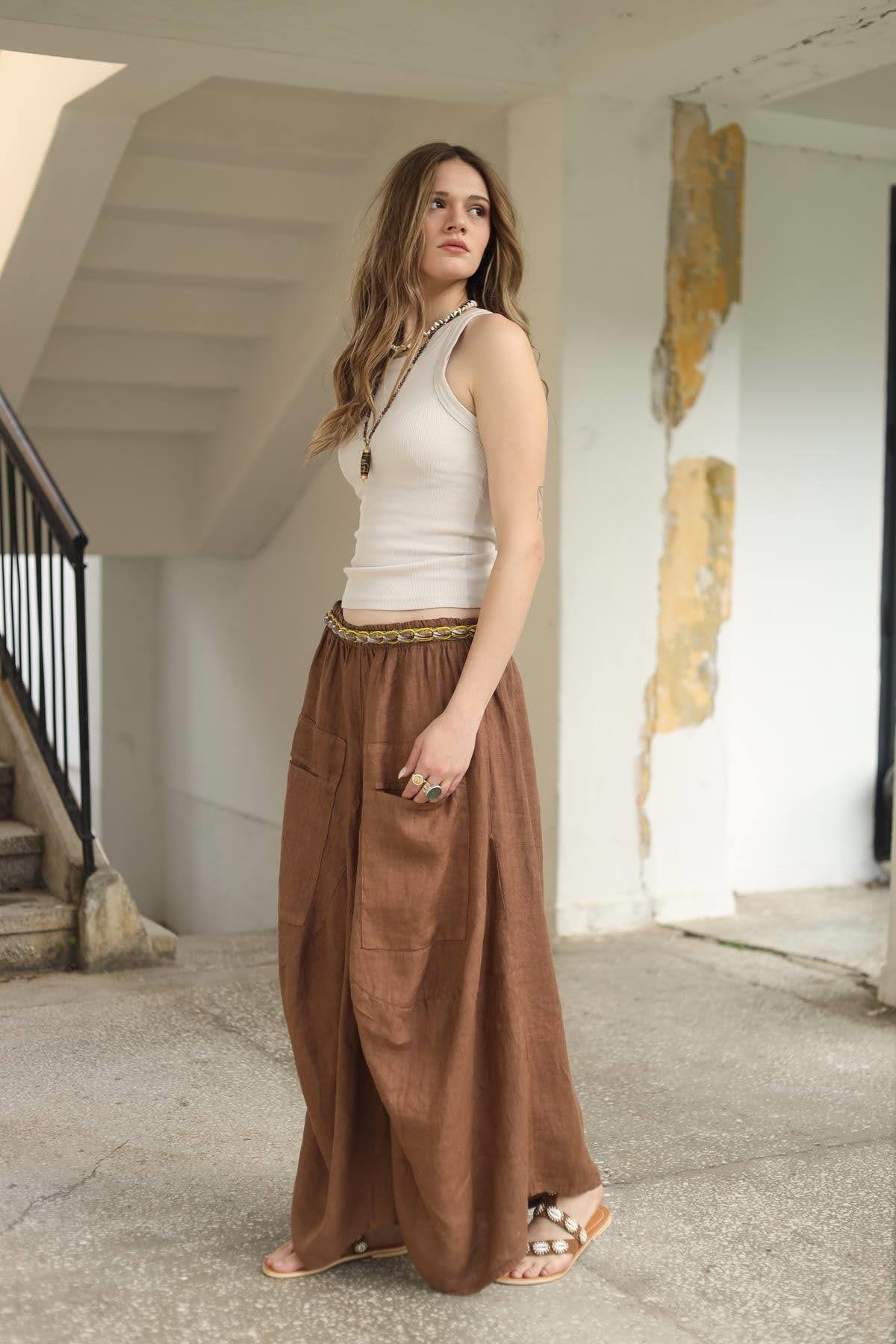 Tarçın Rengi Önü Cepli Keten Şalvar