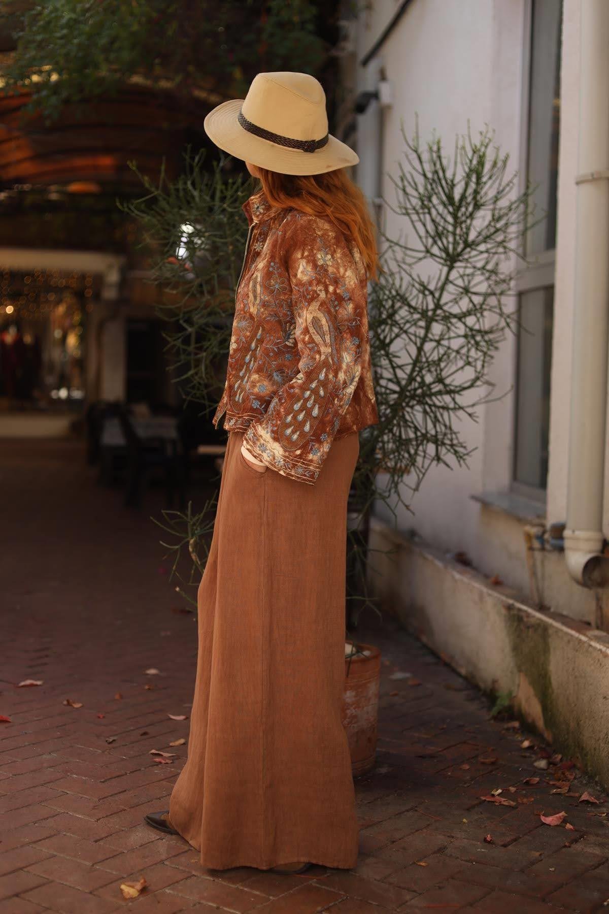 Tarçın Rengi Önü Fermuarlı İşlemeli Ceket