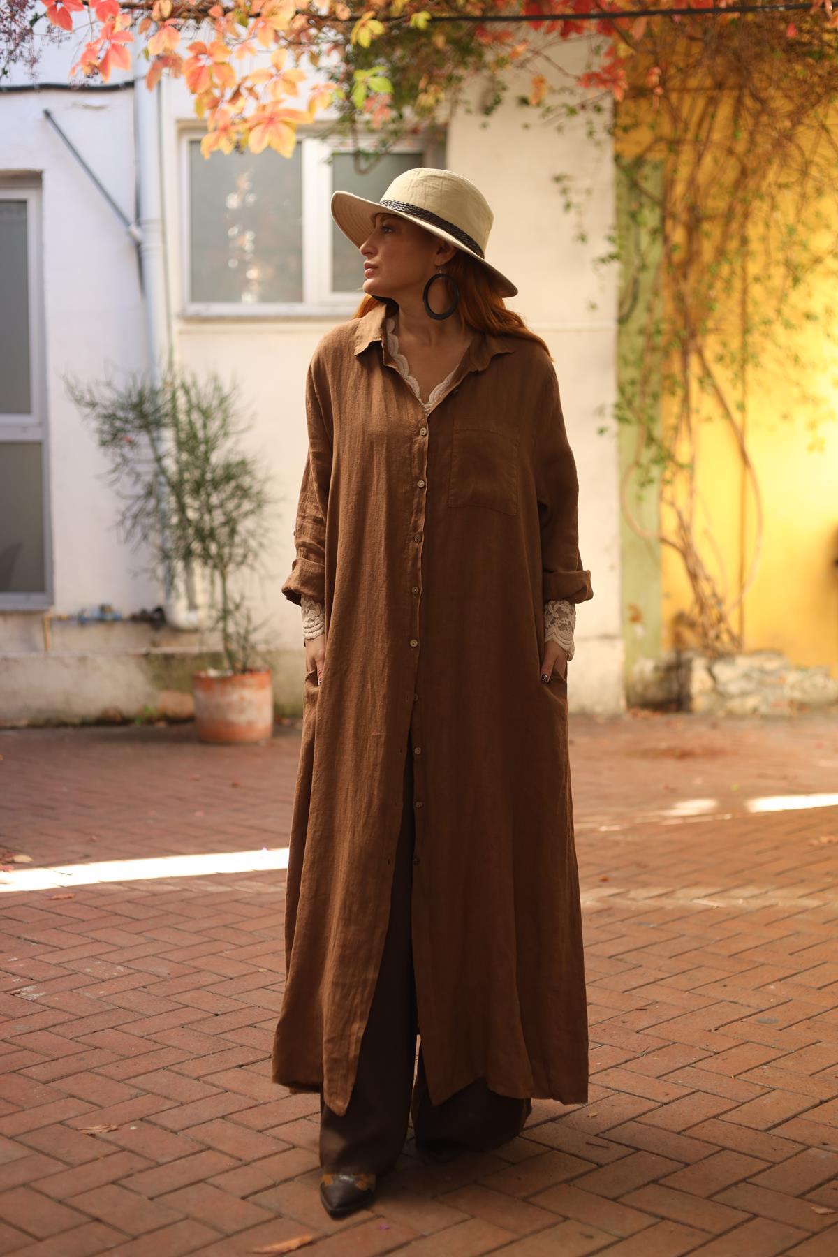 Tarçın Rengi Tek Cepli Keten Gömlek Elbise (KE-FAL-028-KTN-TAR-STD)