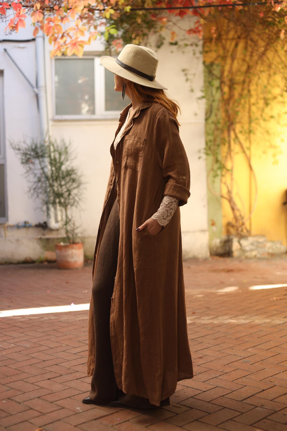 Tarçın Rengi Tek Cepli Keten Gömlek Elbise