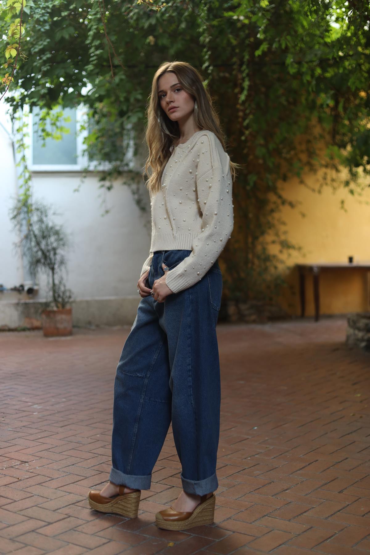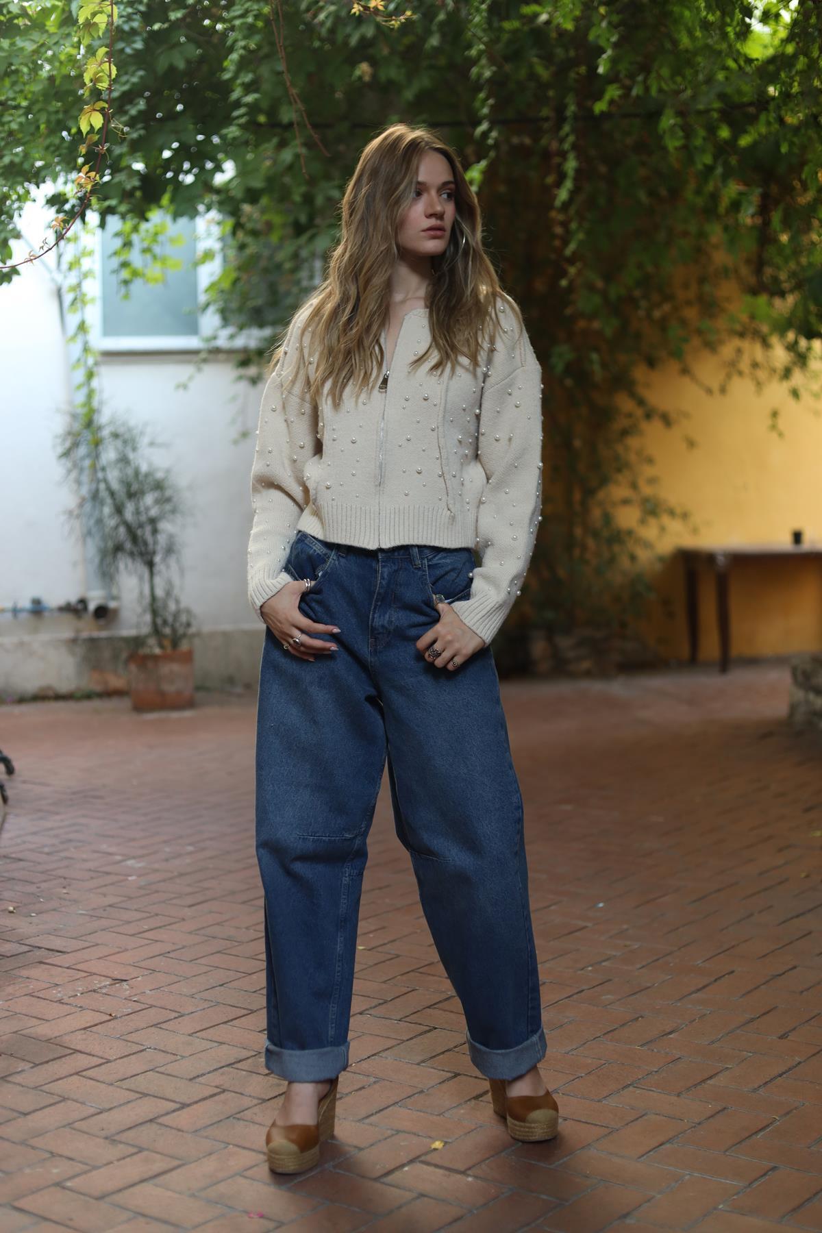 Taş Rengi İnci İşlemeli Drape Detaylı Triko Hırka