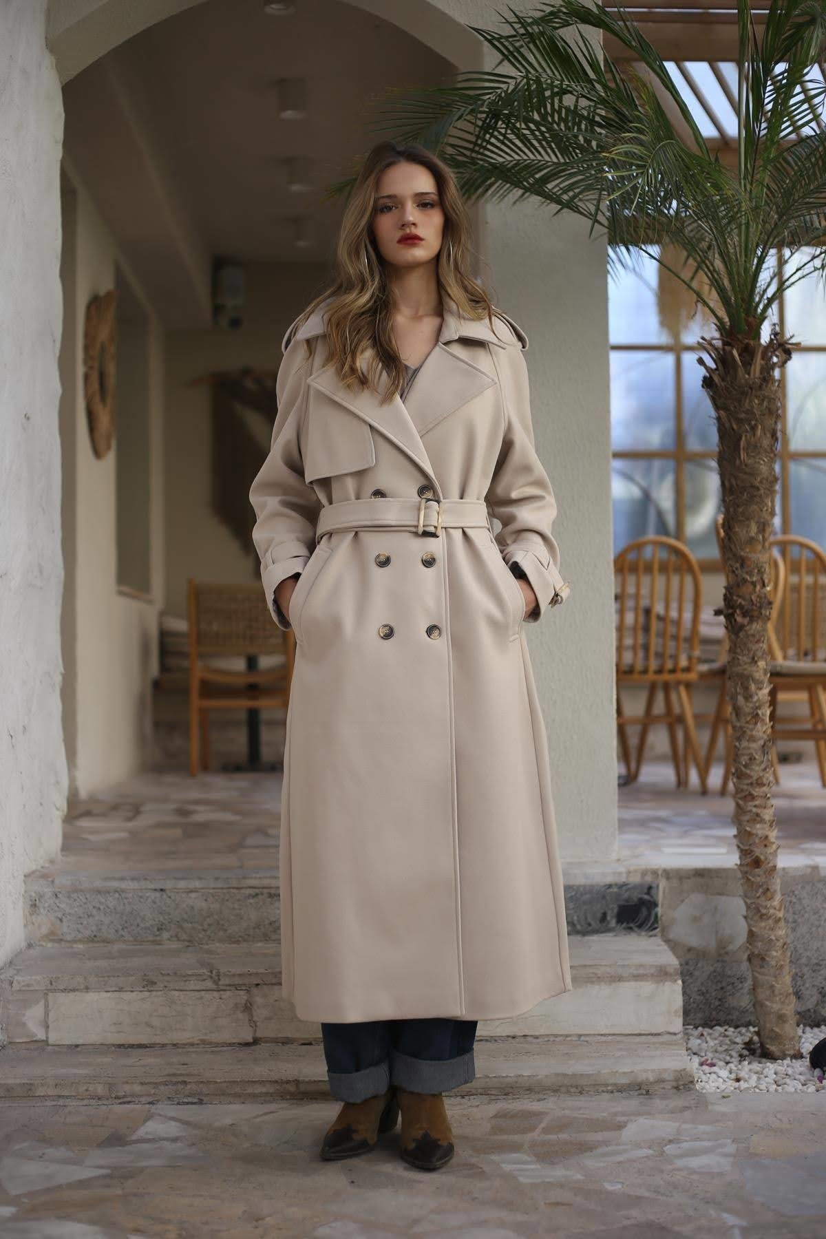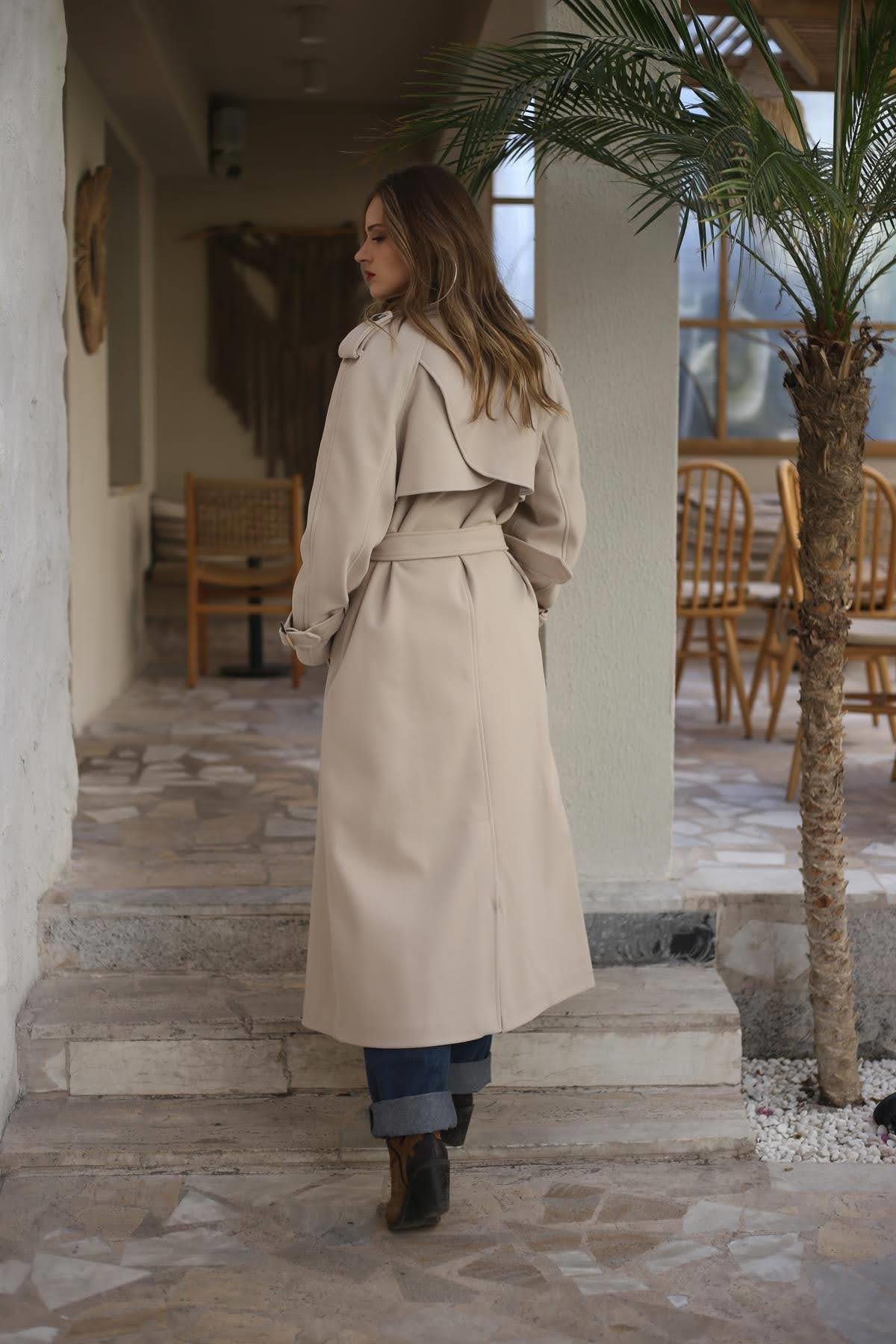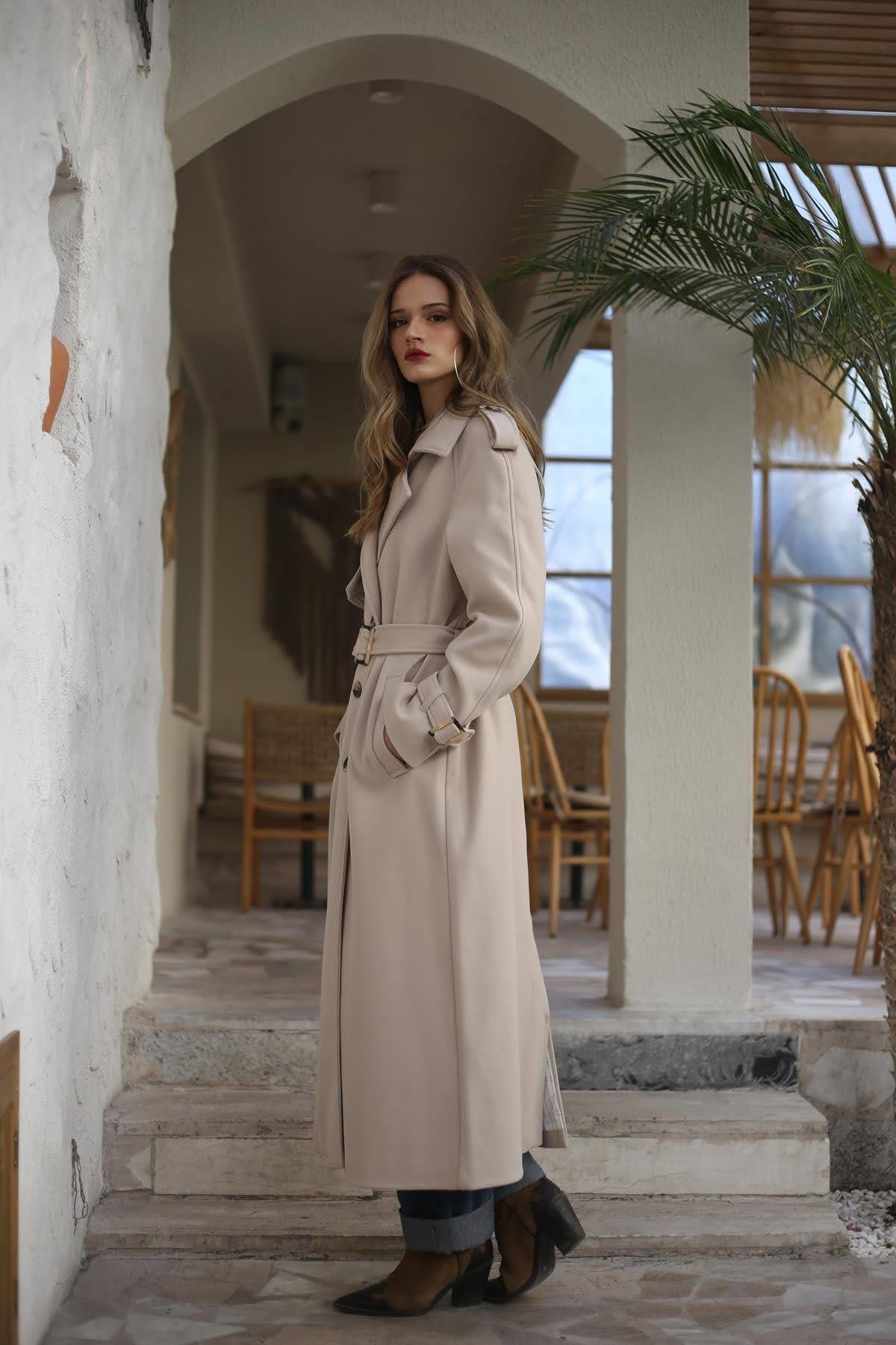 Taş Rengi Kemerli Uzun Trençkot