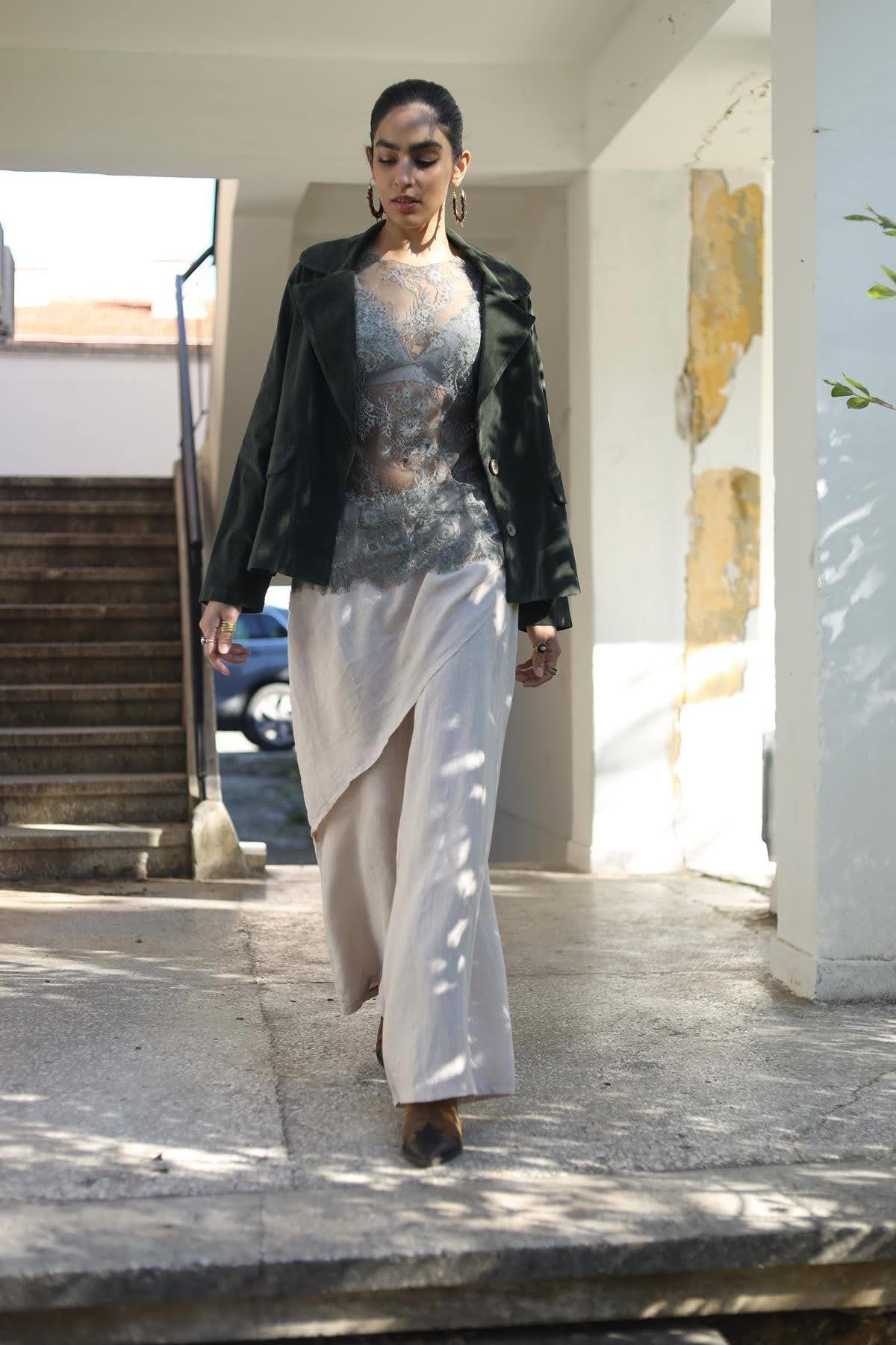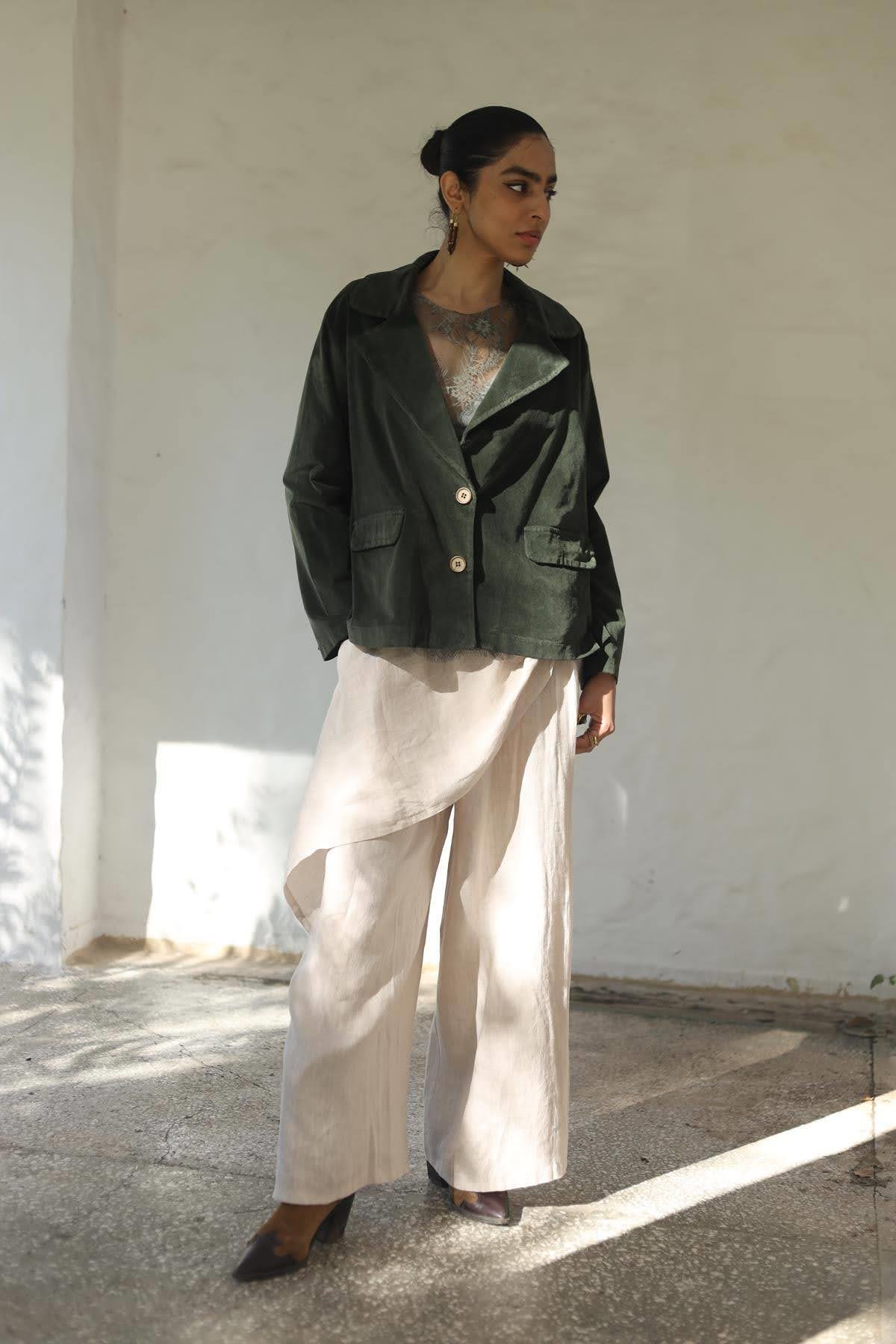 Taş Rengi Önü Kapaklı Keten Pantolon