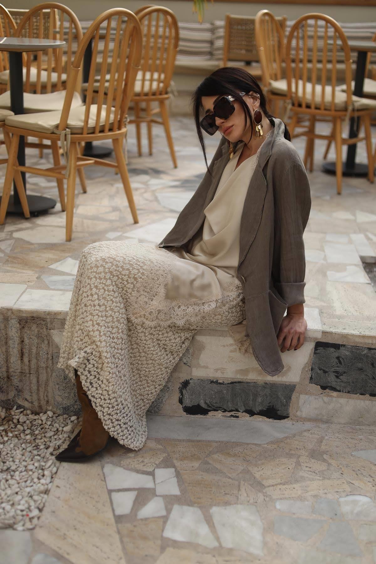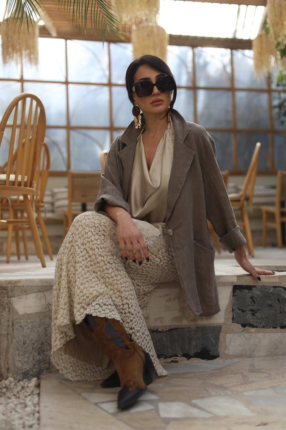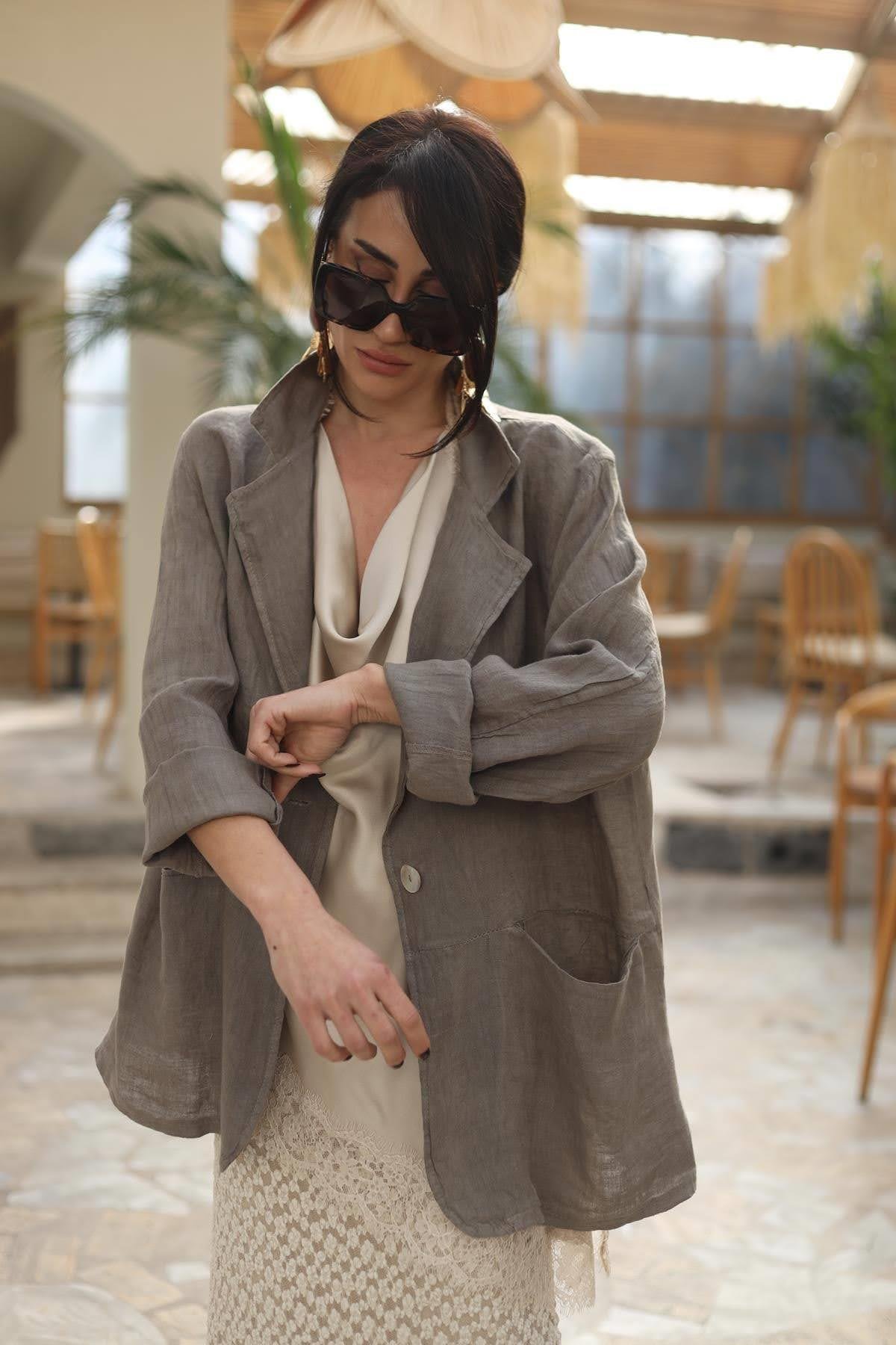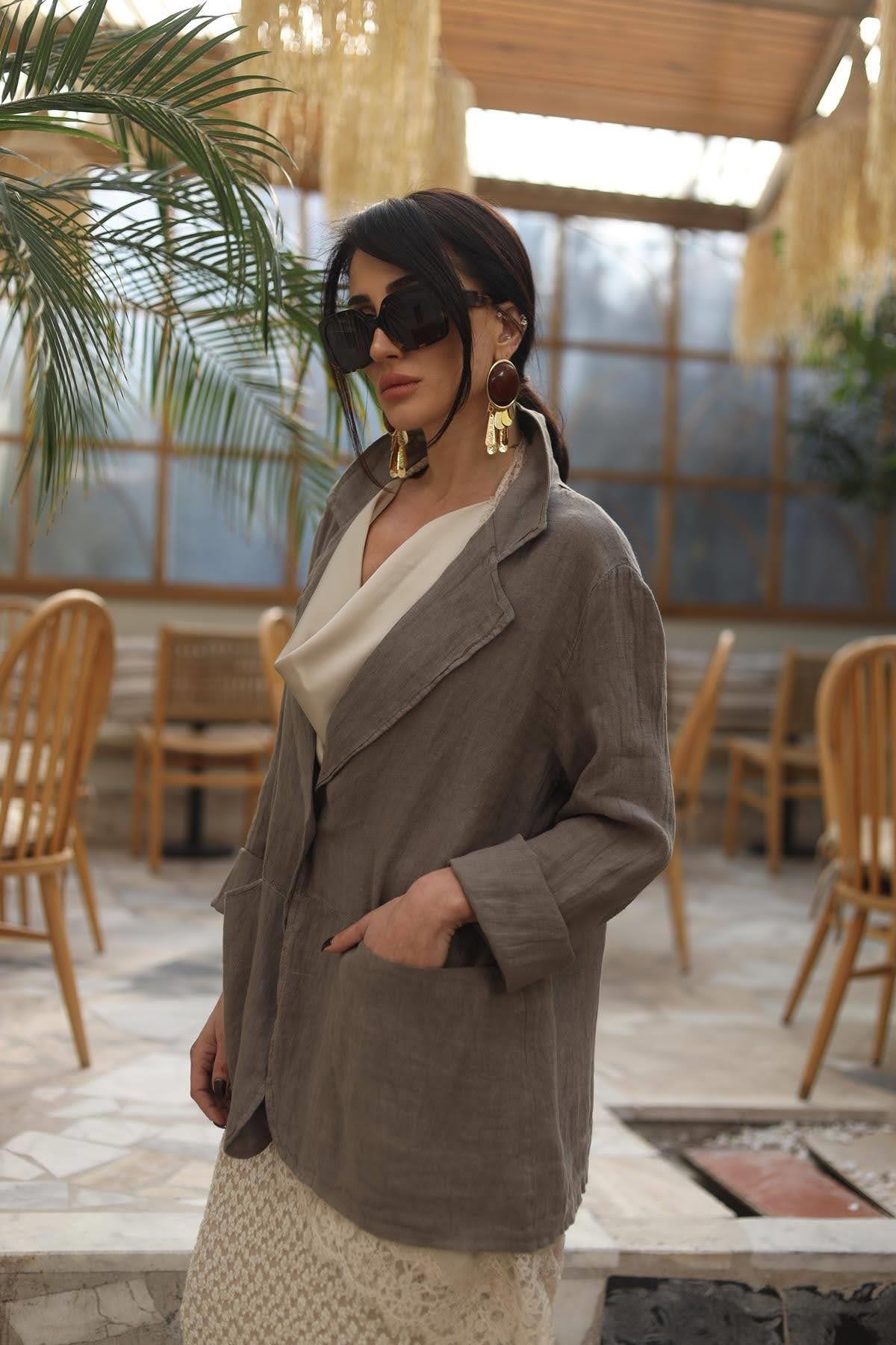 Vizon Rengi Cepli Tek Düğmeli Keten Ceket