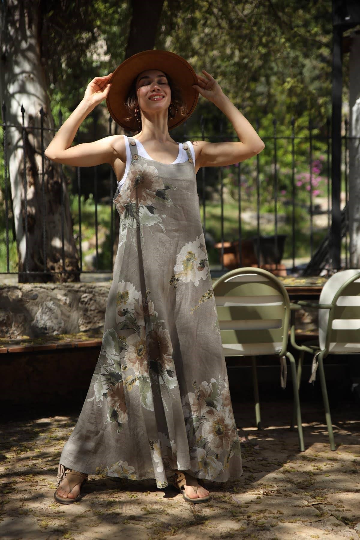 Vizon Rengi Çiçek Desenli Düğme Askılı Keten Elbise
